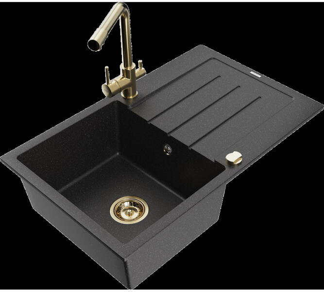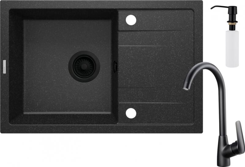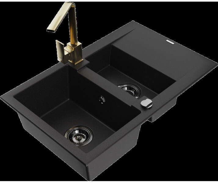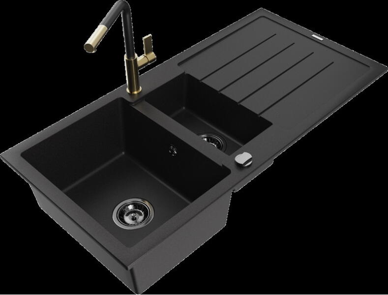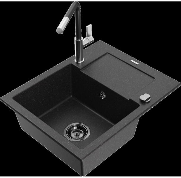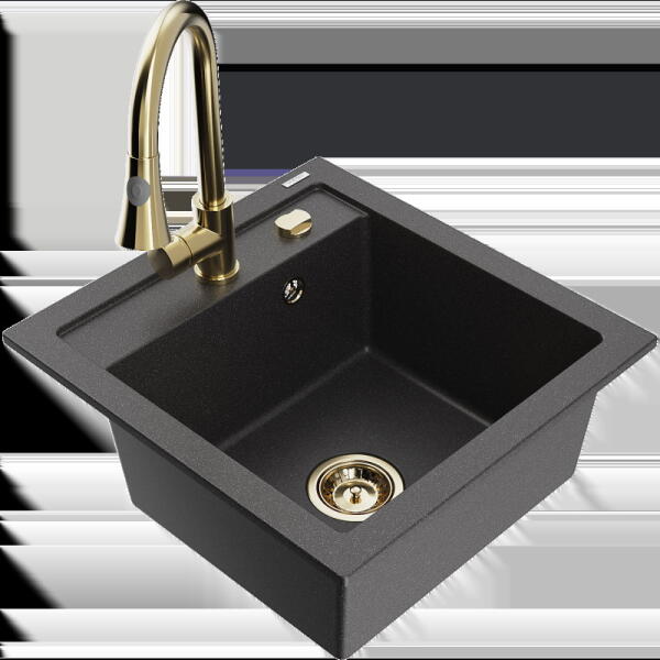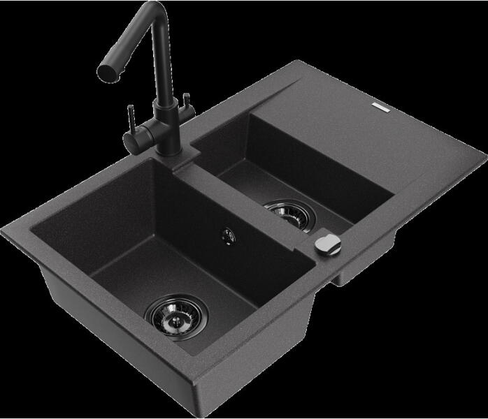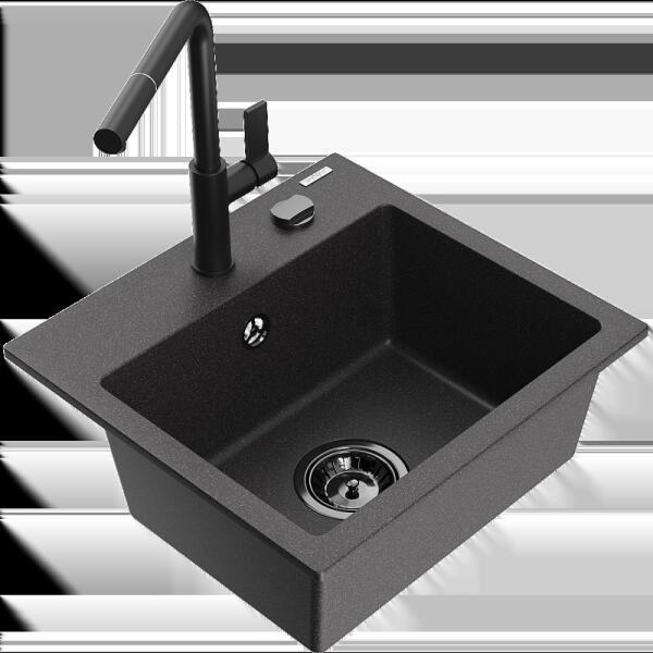 NERO Parma amely kisméretű, de mégis nagyon tágas gránit mosogató csapteleppel, szifonkészlettel és beépíthető mosogatószer adagolóval, matt fekete színben. Egyik nagy előnye, hogy már egy 40 cm széles konyhabútor elembe is beépíthető, emelett az 50 cm-es mélysége kellő méretet biztosít. A medence mélysége is nagynak számít, 18 cm. Tökéletes bármilyen stílusú kon