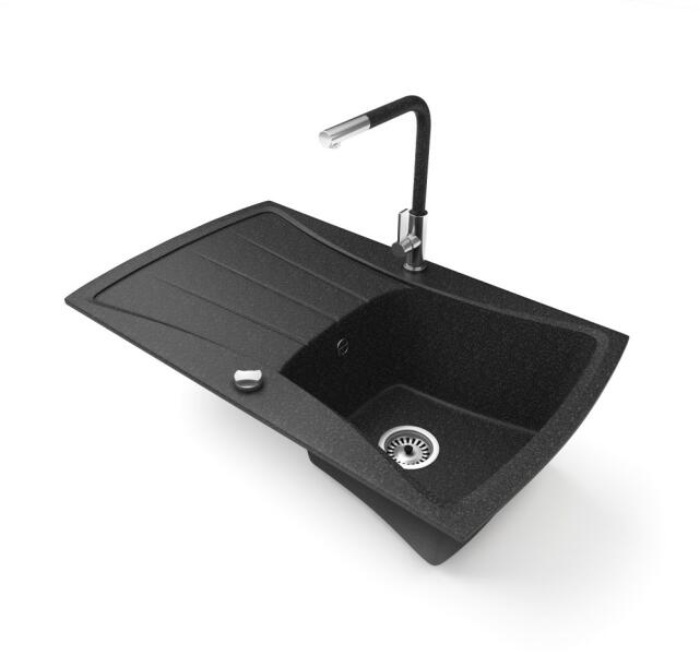 NERO Venezia gránit mosogató szemcsés fekete színben. Egyedi és különleges formával tervezett egymedencés mosogató, kellően nagyméretű csepegtető résszel. A velencei gondolákat idéző, harmonikusan kialakított ívekkel a konyha esztétikus része, emellett anyagvastagságának köszönhetően rendkívül masszív konsktrukció. A mosogatón 2 lyuk található, egy a csaptelepnek