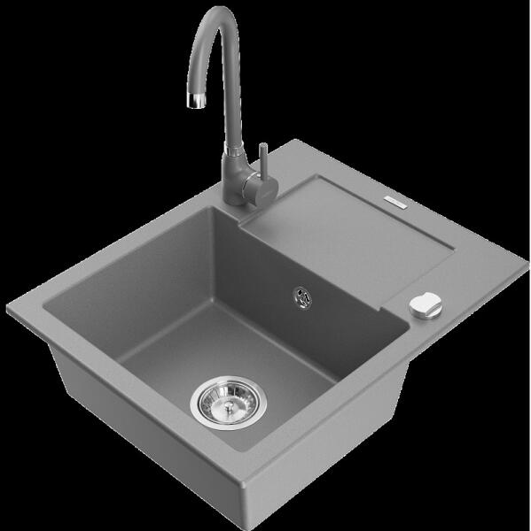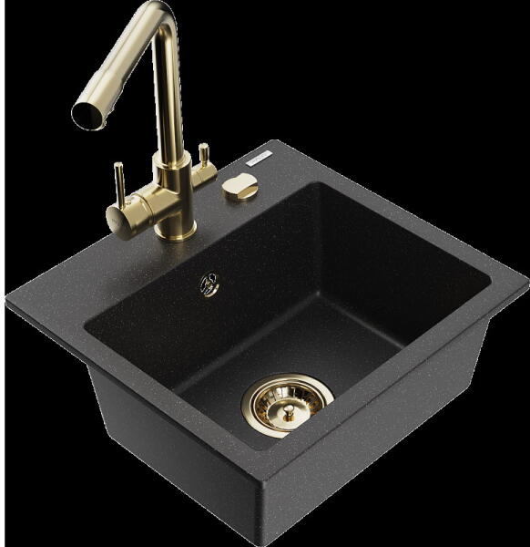 Mexen Enzo, gránit mosogató 576x465x174 mm, 1 kamrás, Duero króm csaptelep, fekete - ezüst metál, 6506-73-671600-00 Gyártó: Mexen Sorozat: Enzo Modell: 1 kamrás, rövid csepegtetővel Hossza 576 mm Szélesség 465 mm Magasság: 174 mm Szín: fekete - ezüst metál Kamra mélysége: 164 mm Kamra mérete: 395x320 mm Szifon + automatikus leeresztő csavar Anyaga: gránit (80% gránit - kő,