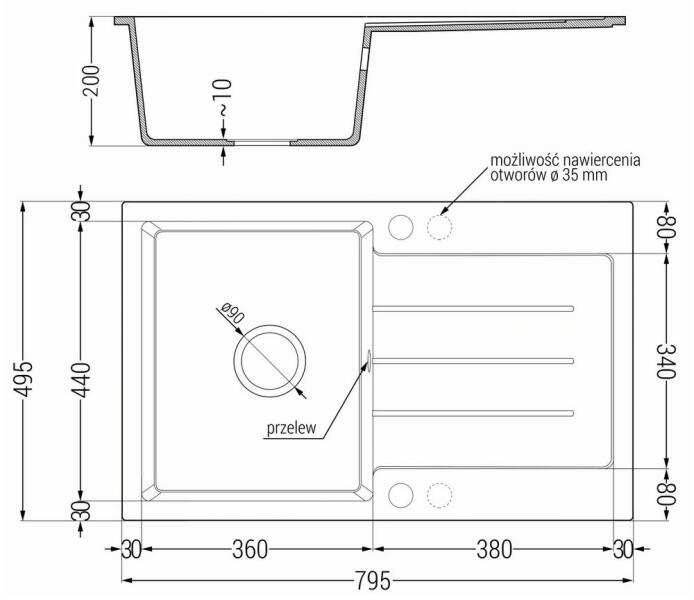 Tomas konyhai mosogató: Gyártó: Mexen Sorozat: Tomas Modell: 2-kamrás csepptálca nélkül Beépítés: felülről a munkalapba süllyesztve Hossz: 800 mm Szélesség: 500 mm Magasság: 190 mm Kamra mélysége: 180 mm (nagyobb), 180 mm (kisebb) Kamra mérete: 440x387 mm (nagyobb), 370x303 mm (kisebb) A lefolyó átmérője: Ø 90 mm Szifon + automatikus leeresztő csavar Anyaga: gránit (80% g
