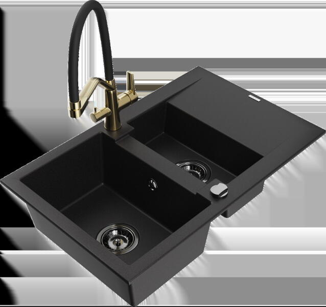 Mexen Bruno - gránit mosogató 79,5x49,5cm + Flex csaptelep, 1 kamrás, fekete, 6513791010-77-Flex Gyártó: Mexen Sorozat: Bruno Modell: 1-kamrás s csepptálca Hossza 795 mm Szélesség 495 mm Magasság: 200 mm Kamra mélysége: 190 mm Kamra mérete: 440x360 mm Szifon + automatikus leeresztő Anyaga: gránit (80% gránit - kő, 20% gyanta) Megnövelt ütésállóság, karcolás, elszíneződé