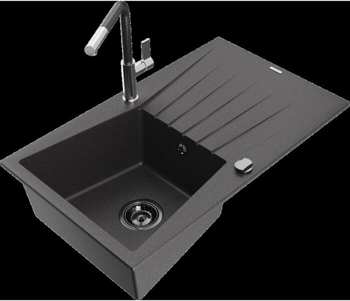 Mosogató Sorozat: Pablo Modell: 1 kamrás Beépítés: a munkalapba való beágyazáshoz Mosogató méretei: 752 x 436 x 161 mm Kamra mérete: 356 x 332 mm Kamra mélysége: 151 mm Lefolyó átmérője: 90 mm Szifon + automatikus leeresztő csavar Anyaga: gránit (80% gránit - kő, 20% gyanta) A sima felület könnyen tisztítható: igen Megnövelt ellenállás az ütésekkel, karcolásokkal, el