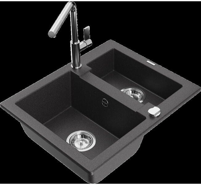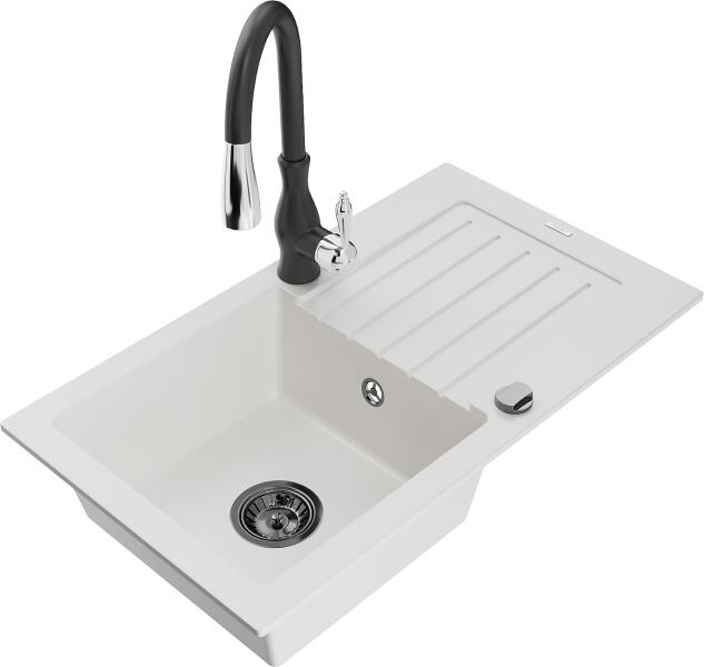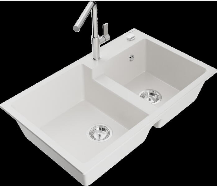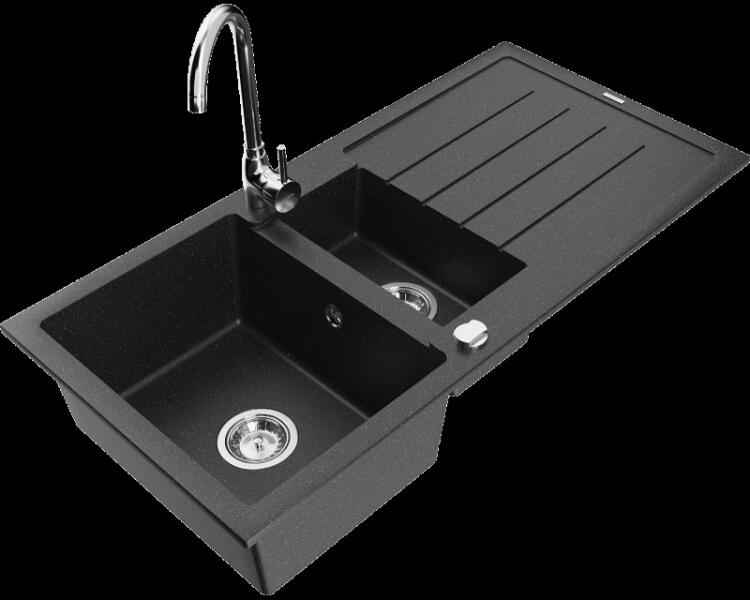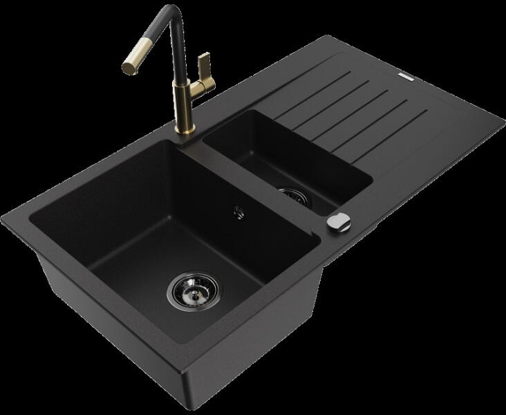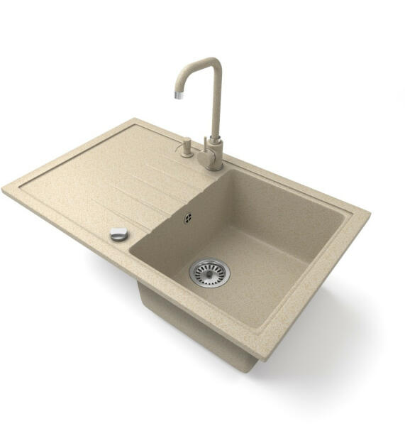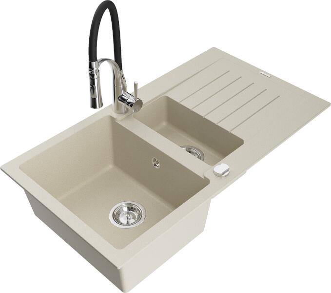 Mexen Matias, gránit mosogató 900x505x200 mm, 1,5 kamrás és Aster mosogató csaptelep, bézs, 6502-69-73450-07 Gyártó: Mexen Sorozat: Matias Modell: 1,5-kamrás lefolyóval Beépítés: felülről a munkalapba való beágyazáshoz Szín: bézs Felületkezelés: sima Hossza 900 mm Szélesség 505 mm Magasság: 200 mm Kamra mélysége: 180 mm (nagyobb), 115 mm (kisebb) Kamra mérete: 435x335 m