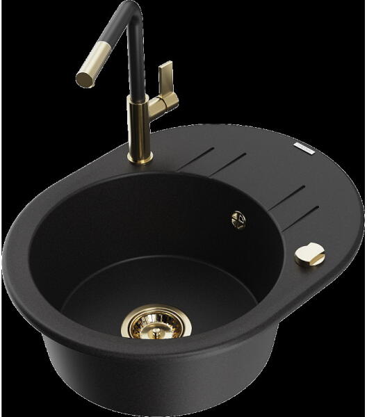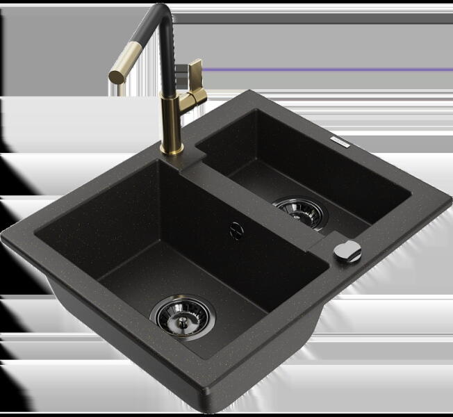 Mexen Carlos, gránit mosogató 582x475x177 mm, 1,5 kamrás és mosogató csaptelep Carla, fekete-arany metál, 6518-75-670700-70-B Műszaki adatok: Gyártó: Mexen Sorozat: Carlos Modell: 1,5-kamrás csepptálca nélkül Beépítés: felülről a munkalapba süllyesztve Szín: fekete/arany metál Hossza 582 mm Szélesség 475 mm Magasság: 177 mm Kamra mélysége: 162 mm (nagyobb), 102 mm (kisebb