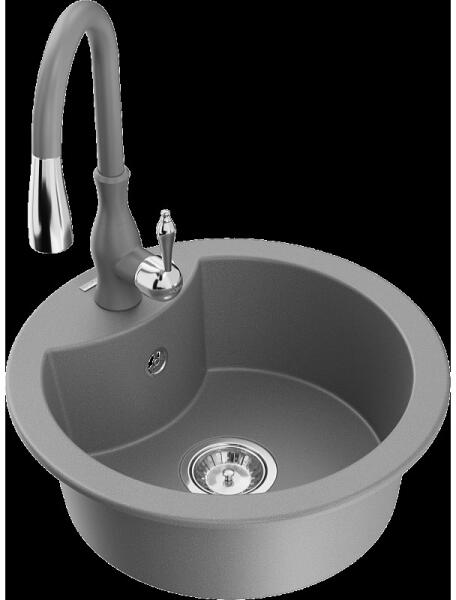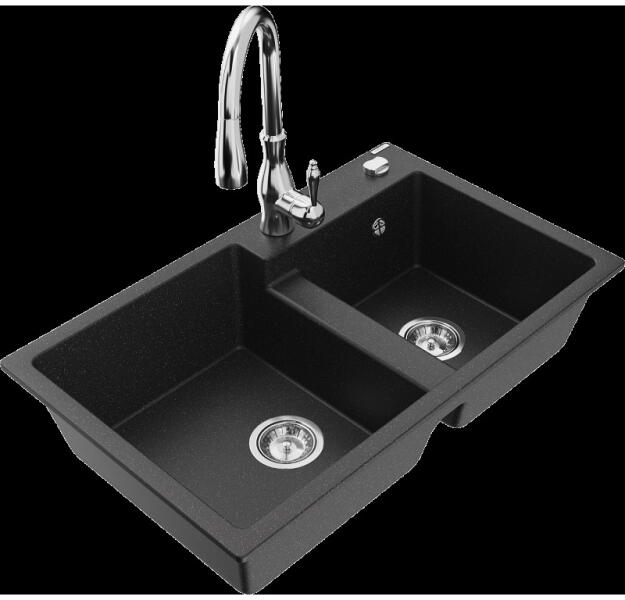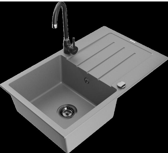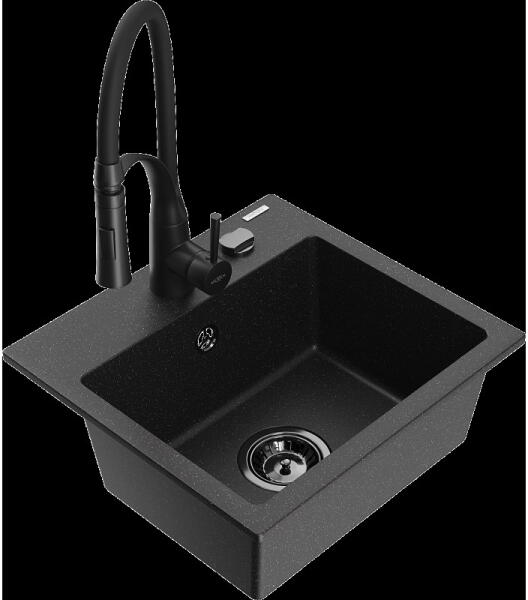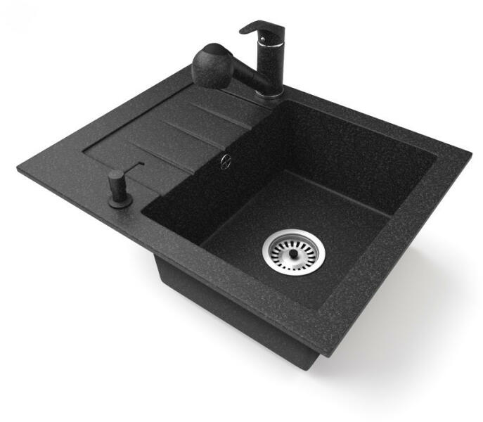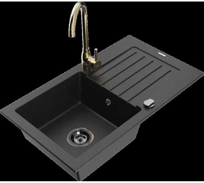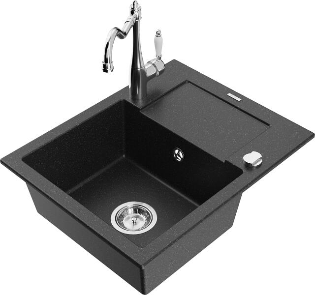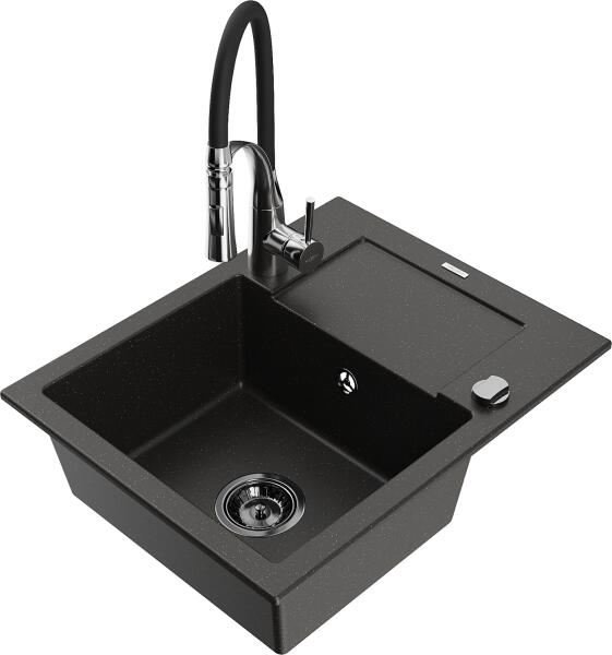 Mexen Enzo, gránit mosogató 576x465x174 mm, 1 kamrás és mosogató csaptelep Carla, fekete-ezüst metál, 6506-73-670700-00 Gyártó: Mexen Sorozat: Enzo Modell: 1 kamrás, rövid csepegtetővel Beépítés: felülről a munkalapba süllyesztve Hossza 576 mm Szélesség 465 mm Magasság: 174 mm Szín: fekete/ezüst metál Kamra mélysége: 164 mm Kamra mérete: 395x320 mm Szifon + automatikus l