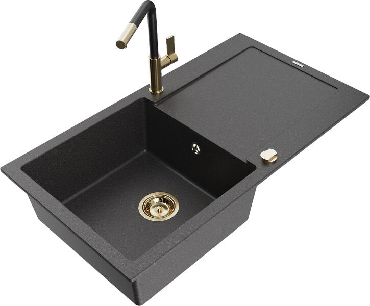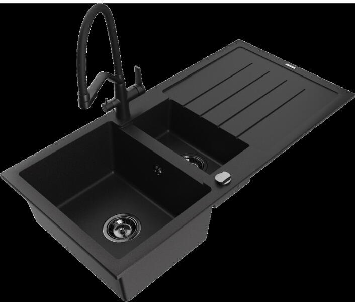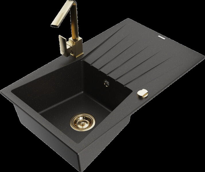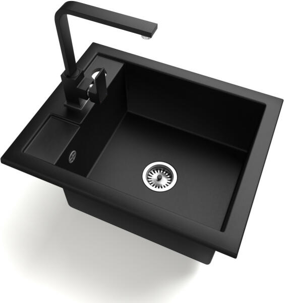 Mexen Bruno, 1 kamrás gránit mosogató lefolyóval 795x495x200 mm fekete Telma konyhai csapteleppel, fekete, 6513-77-670200-70-B Mosogató: Termékkód: 6513791010-77 Mérete: 795x495x200 mm Kamra mélysége: 190 mm Kamra méretei: 440x360 mm Lefolyó átmérője: ø90 mm Típus: 1 kamrás csepegtetővel Típus: a munkalapba süllyesztve Fekete szín Anyaga: gránit (80% gránit adalékanyag 20%