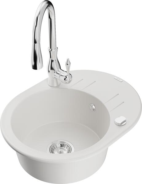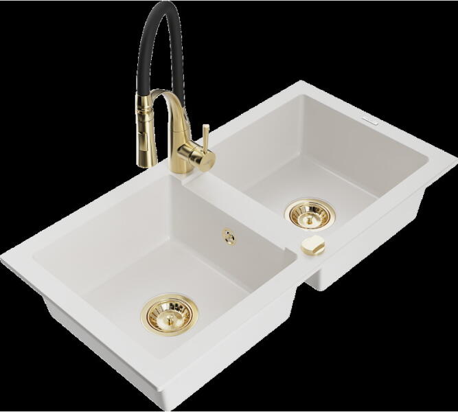 Mexen Kevin, gránit mosogató 586x458x190 mm, 1 kamrás és Savita mosogató csaptelep, fehér, 6517-20-672601-00 Gyártó: Mexen Sorozat: Kevin Fehér szín Modell: 1 kamrás, rövid leeresztővel Beépítés: a munkalapba való beágyazáshoz Méretek: 586 x 458 x 190 mm Kamra mérete: 378 x 374 mm Kamra mélysége: 175 mm A lefolyó átmérője: Ø 90 mm Szifon + automatikus leeresztő csavar