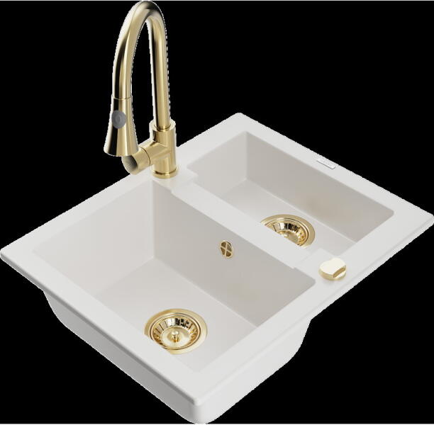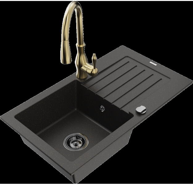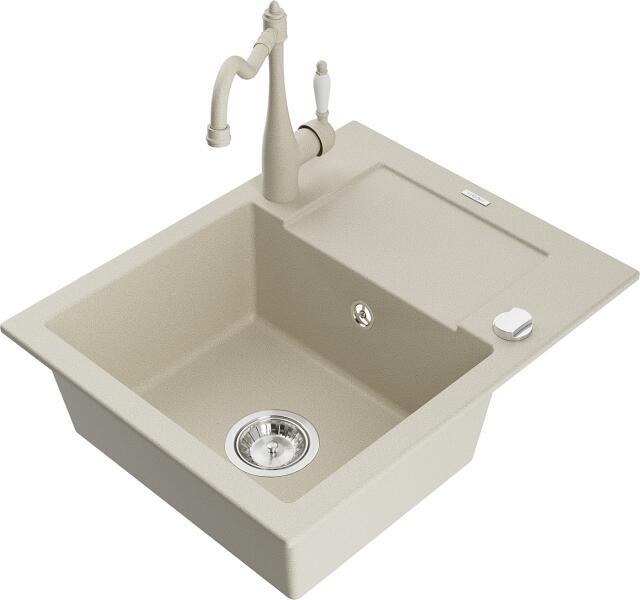 Mexen Enzo, gránit mosogató 576x465x174 mm, 1 kamrás és mosogató csaptelep Carla, bézs, 6506-69-670700-69 Gyártó: Mexen Sorozat: Enzo Modell: 1 kamrás, rövid csepegtetővel Beépítés: felülről a munkalapba süllyesztve Hossza 576 mm Szélesség 465 mm Magasság: 174 mm Szín: bézs Kamra mélysége: 164 mm Kamra mérete: 395x320 mm Szifon + automatikus leeresztő csavar Anyaga: grán