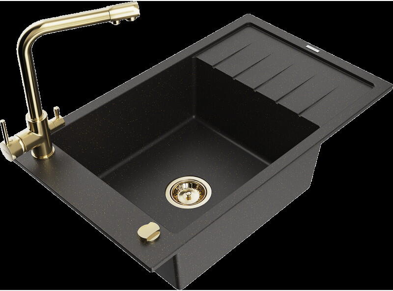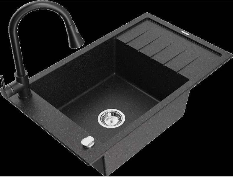 Mexen Pablo, gránit mosogató 752x436x161 mm, 1 kamrás és Savita mosogató csaptelep, fekete-ezüst metál, 6510-73-672601-70-B Gyártó: Mexen Sorozat: Pablo Méretek: 752x436x161 mm Kamra mélysége: 151 mm Kamra méretei: 356x332 mm Lefolyó átmérője: ø90 mm Szín: fekete-ezüst metál Típus: 1 kamrás csepegtetővel Típus: a pultba süllyesztve Anyaga: gránit (80% gránit adalékanya