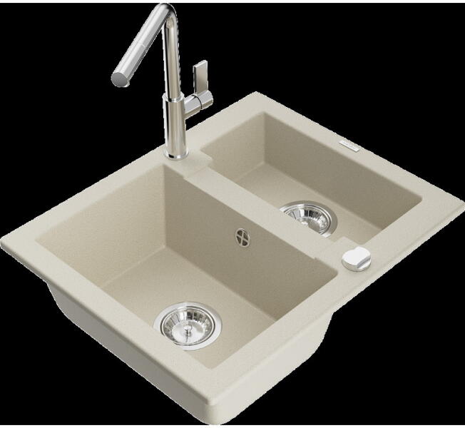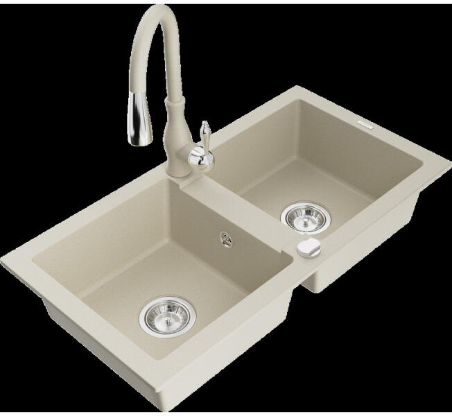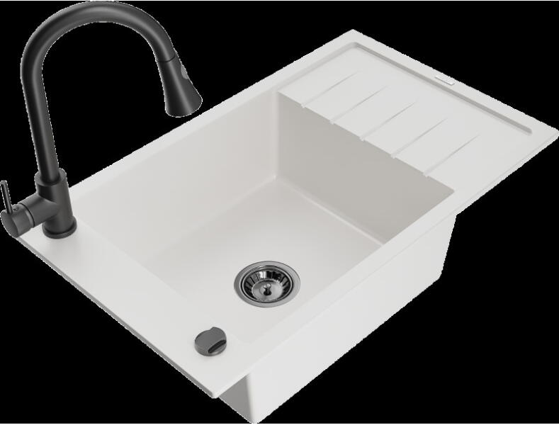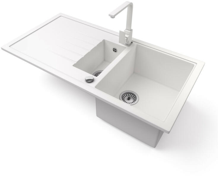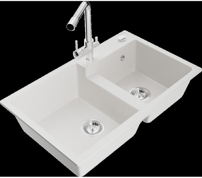 NERO Verso gránit mosogatótálca fehér színben csapteleppel és automata dugókiemelővel. Kétmedencés, szimmetrikus elrendezésű mosogató, kellően nagyméretű medencékkel, a 75 cm-es szélesség egyszerre tágas és helytakarékos is. Letisztult formatervezés, kiemelkedő anyagvastagság jellemzi, ezáltal rendkívül masszív és ellenálló konstrukció. Anyaga 80% gránit őrlemén