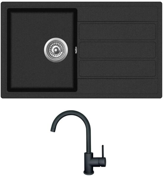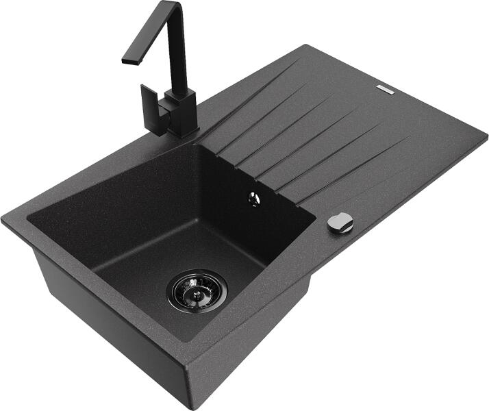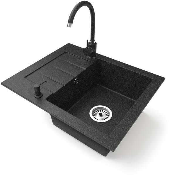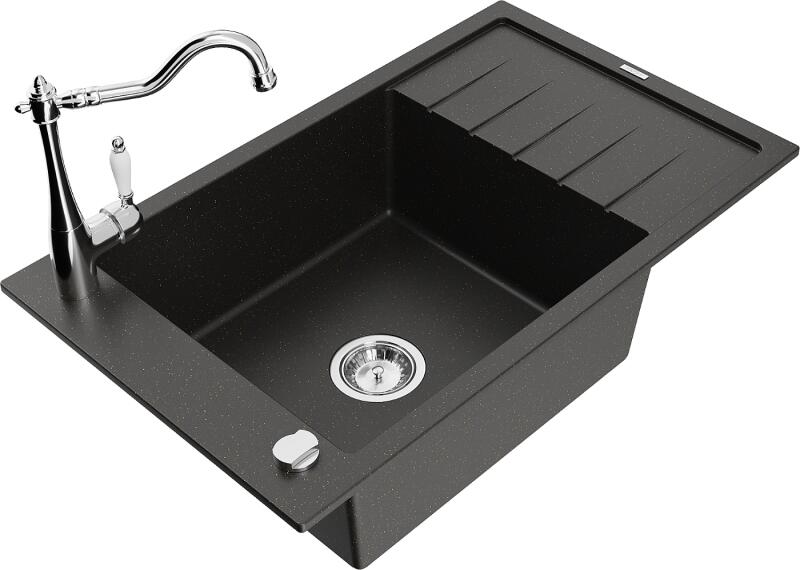 Mexen Cesar, gránit mosogató 775x470x190 mm, 1 kamrás, fekete foltos fekete szifonnal és fekete Rita mosogatócsappal, 6514-76-670300-70-B A konyhai mosogató műszaki adatai: Gyártó: Mexen Sorozat: Cesar Modell: 1 kamrás Felszerelés: munkalapra Szín: fekete foltos Felület: sima Hossza 775 mm Szélesség 470 mm Magasság: 190 mm Kamra mélysége: 180 mm Kamra mérete: 410x355 mm Lefoly