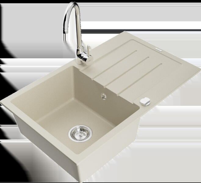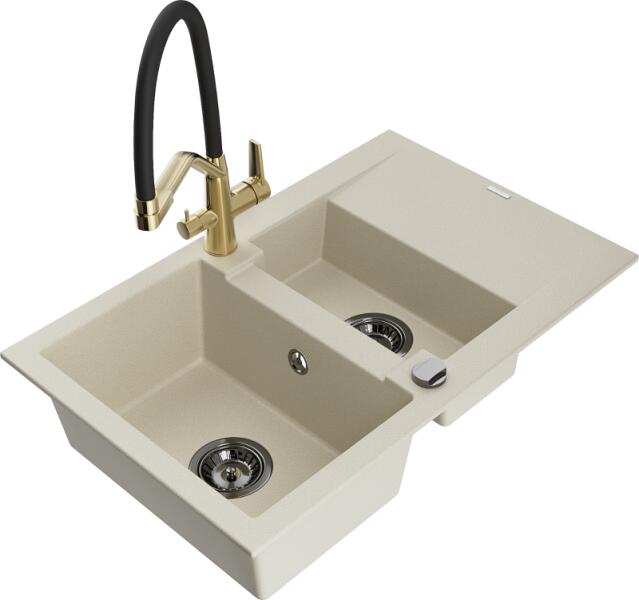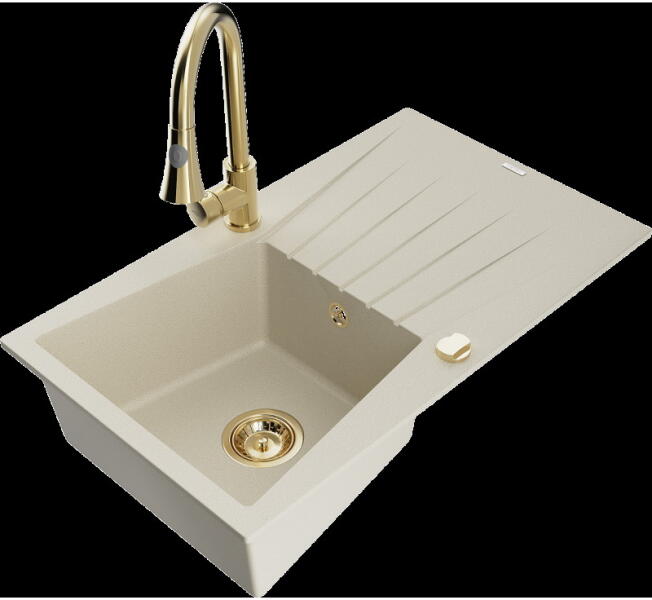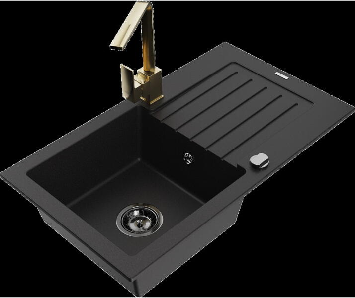Mexen Elias, gránit mosogató 795x480x200 mm, 1 kamrás és mosogató csaptelep Carla, fekete-arany metál, 6511-75-670700-00 Elias konyhai mosogató: Szín: fekete - arany metál Méretek: 795x480x200 mm Kamra mélysége: 190 mm Kamra méretei: 465x420 mm Lefolyó átmérője: ø90 mm Típus: 1 kamrás, rövid csepegtetővel Beépítés: felülről a munkalapba süllyesztve Anyaga: gránit (80%