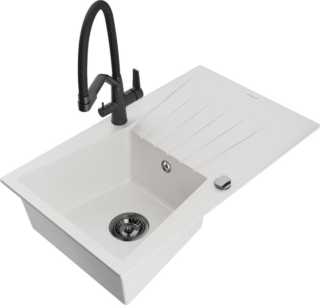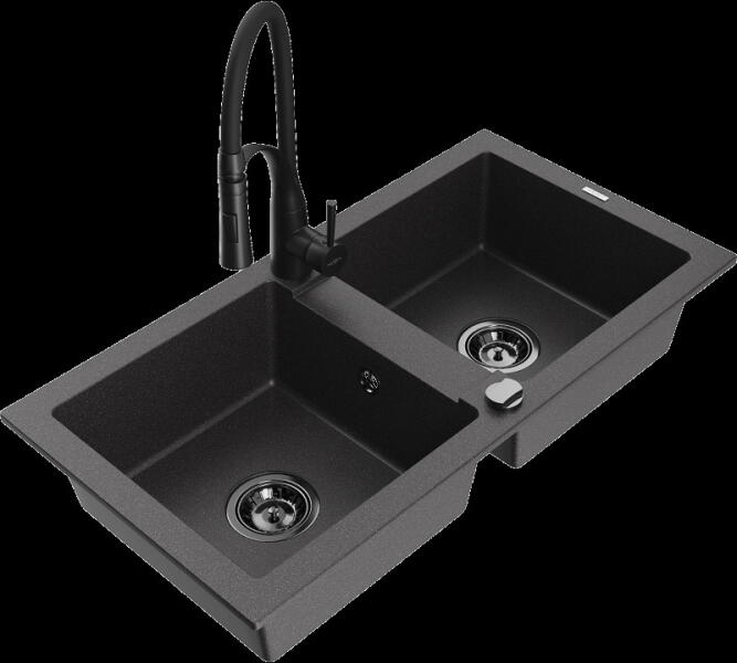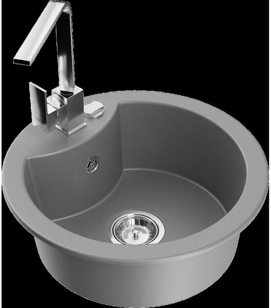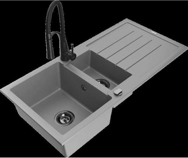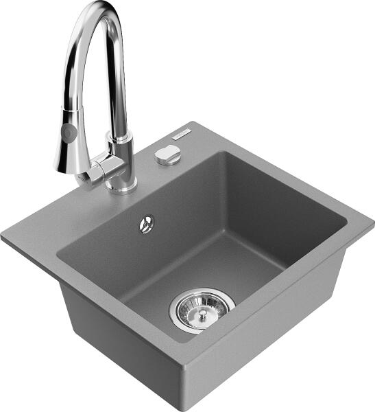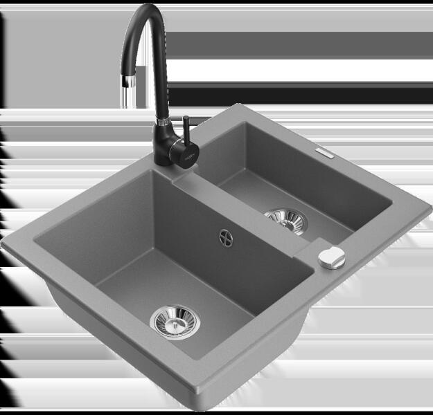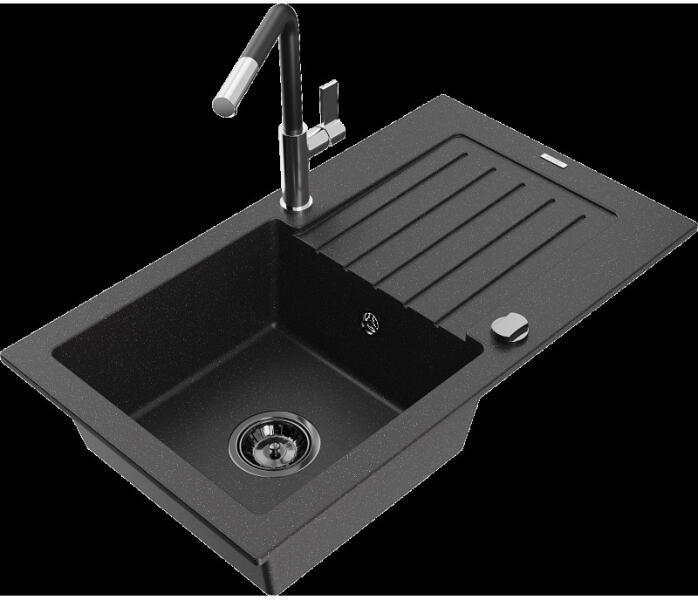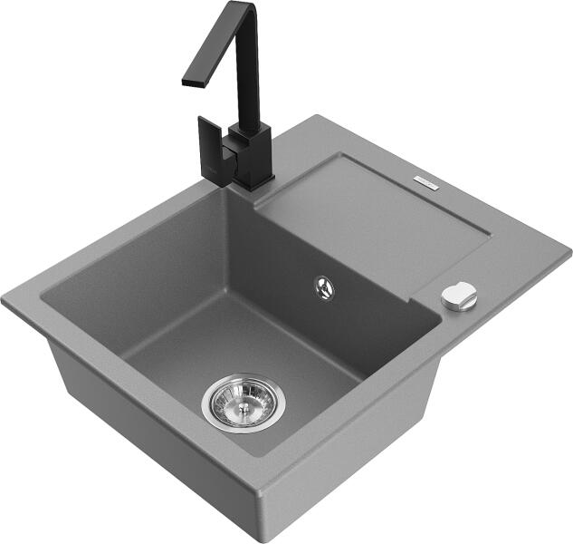 Mexen Enzo, gránit mosogató 576x465x174 mm, 1 kamrás és fekete csaptelep Rita, szürke, 6506-71-670300-70 Gyártó: Mexen Sorozat: Enzo Modell: 1 kamrás, rövid csepegtetővel Hossza 576 mm Szélesség 465 mm Magasság: 174 mm Szín: szürke Kamra mélysége: 164 mm Kamra mérete: 395x320 mm Szifon + automatikus leeresztő csavar Anyaga: gránit (80% gránit - kő, 20% gyanta) Megnövelt elle