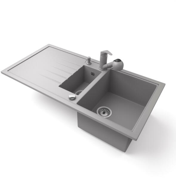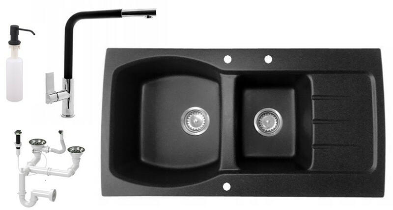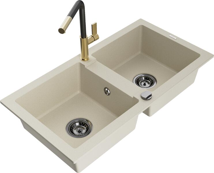 Mario konyhai mosogató: Méretek: 820x436x161 mm Kamra mélysége: 151 mm Kamra méretei: 356x336 mm Lefolyó átmérője: ø90 mm Típus: 2 kamrás Típus: felülről a munkalapba süllyesztve Anyaga: gránit (80% gránit adalékanyag 20% gyanta) Túlfolyó lyuk: igen Lyukak: 2 (1 x mosogató csaptelep, 1 x automatikus leeresztő csavar vezérlés) Nagy ellenállás a karcolásokkal és el