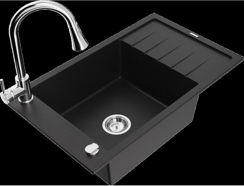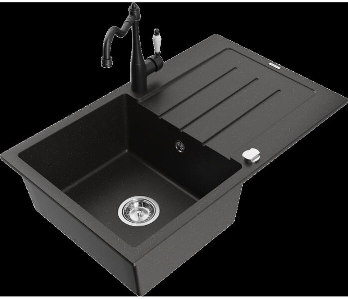 Másfél medencés gránit mosogató szemcsés fekete színben. Ez a modell egyesíti a praktikumot a stílusos megjelenéssel. Nagy medencéinek köszönhetően kényelmes mosogatást tesz lehetővé. Egyik különlegessége az átlag feletti méretű gyümölcsmosó rész. A két medence lehetővé teszi párhuzamosan a mosogatást, öblítést vagy csak a vízben tartást a főzéskor. Nagy mé