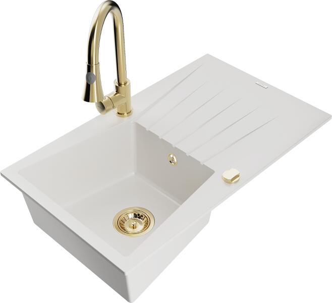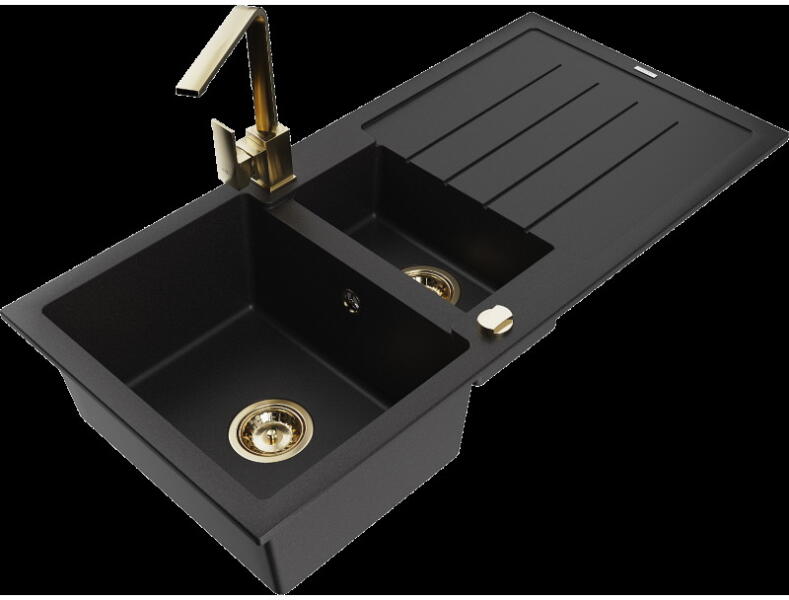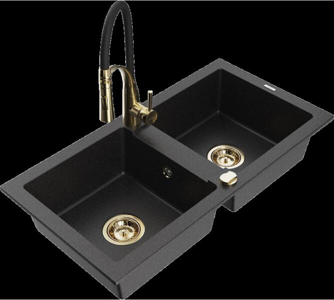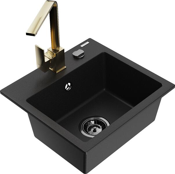 Mexen Milo, 1 kamrás gránit mosogató 435x410x171 mm és Rita arany csaptelep, fekete, 6505-77-670300-50-B Mosogató: Gyártó: Mexen Sorozat: Milo Fekete szín Mérete: 435x410x171 mm Kamra mélysége: 161 mm Kamra méretei: 375x280 mm Lefolyó átmérője: ø90 mm Típus: 1 kamrás Típus: A pult tetejébe süllyesztett Anyaga: gránit (80% gránit adalékanyag 20% gyanta) Túlfolyó lyuk: ige