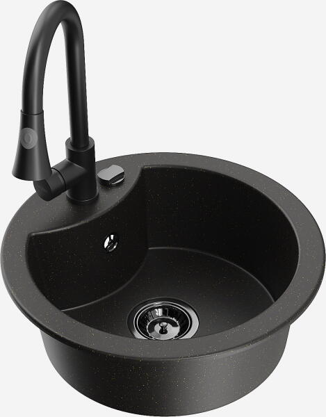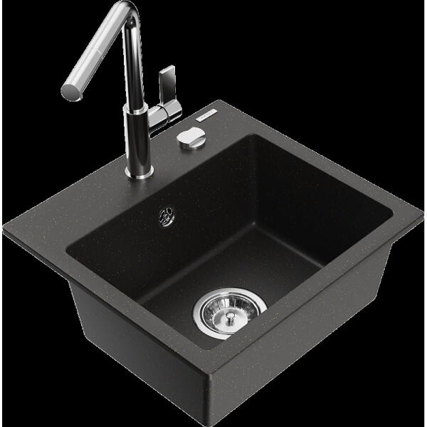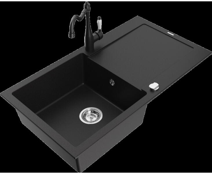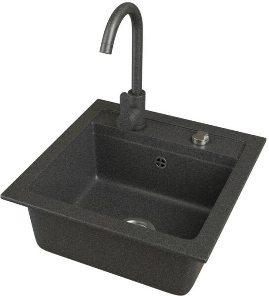 Laneo gránit mosogató szett fekete színben. Teljes készlet, ami tartalmazza a magasított csaptelepet, a beépített mosogatószer adagolót és a szifonkészletet. Méreténél fogva ideális kisméretű konyhákba, ahol az okos helykihasználás lényeges. Már egy 40 cm széles mosogató szekrénybe is beépíthető. Kis mérete ellenére kellően öblös, a 17 cm mély medencének köszön