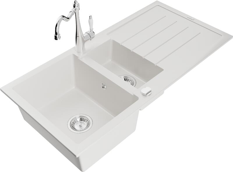 Mexen Andres, gránit mosogató 1000x500x200 mm, 1,5 kamrás és mosogató csaptelep Carla, fehér, 6515-20-670700-00 Gyártó: Mexen Sorozat: Andres Modell: 1,5-kamrás lefolyóval Felszerelés: munkalapra Fehér szín Felületkezelés : sima Hossza 1000 mm Szélesség 500 mm Magasság: 200 mm Kamra mélysége: 190 mm (nagyobb), 115 mm (kisebb) Kamra mérete: 430x330 mm (nagyobb), 340x170 mm (kis