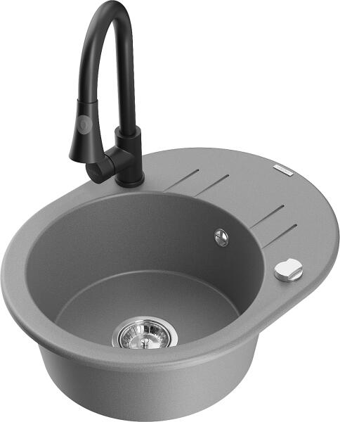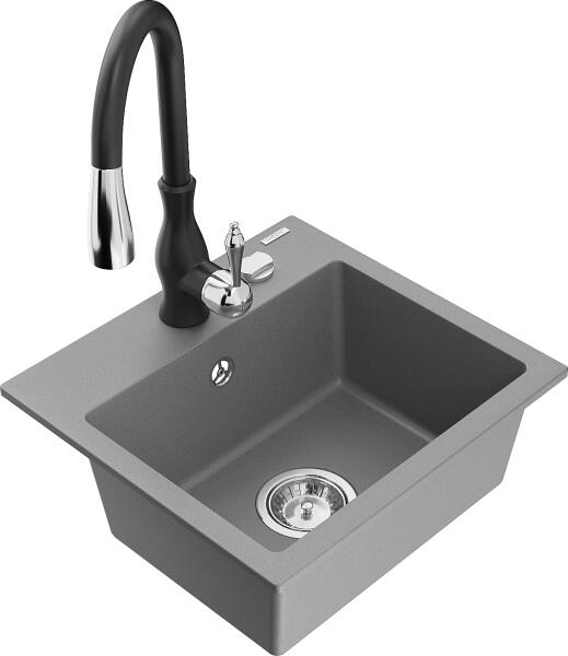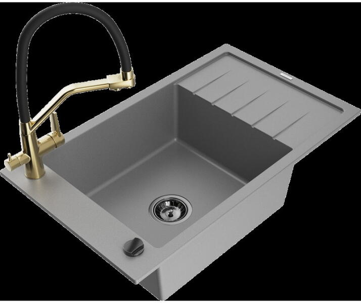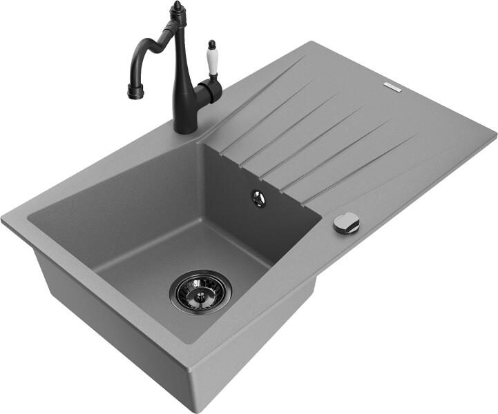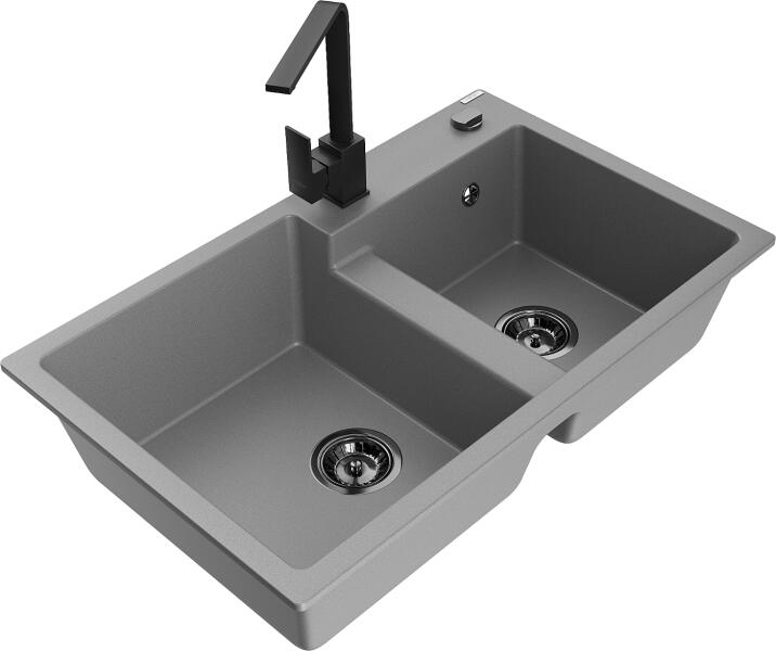 Mexen Tomas, gránit mosogató 800x500x190 mm, 2 kamrás és fekete csaptelep Rita, szürke, 6516-71-670300-70-B A konyhai mosogató műszaki adatai: Gyártó: Mexen Sorozat: Tomas Modell: 2-kamrás csepptálca nélkül Felszerelés: munkalapra Szín: szürke Felület: sima Hossza 800 mm Szélesség 500 mm Magasság: 190 mm Kamra mélysége: 180 mm (nagyobb), 180 mm (kisebb) Kamra mérete: 440x38