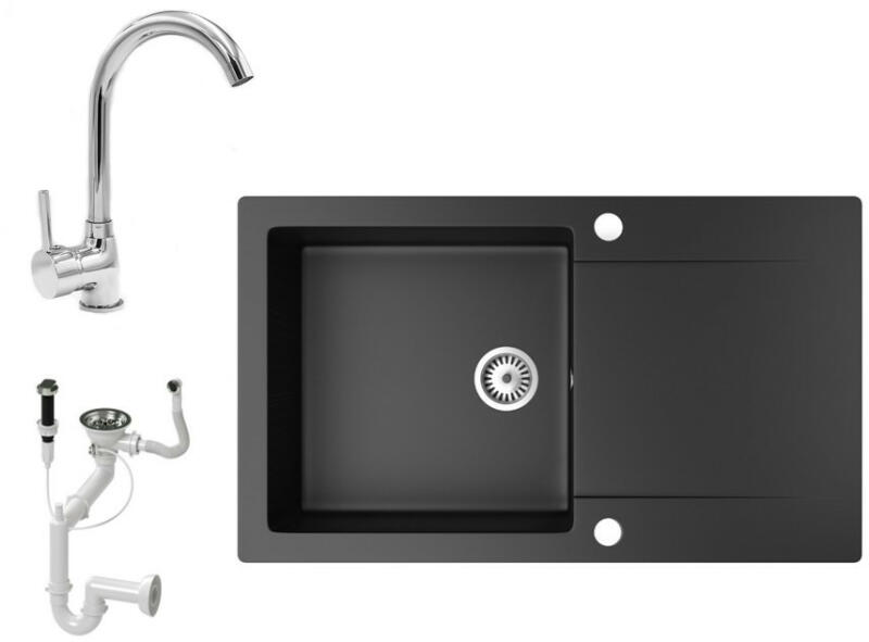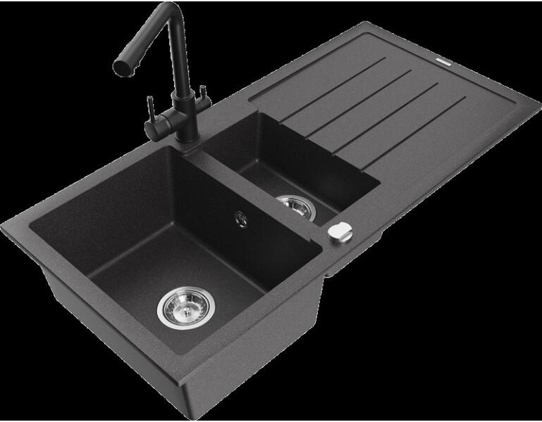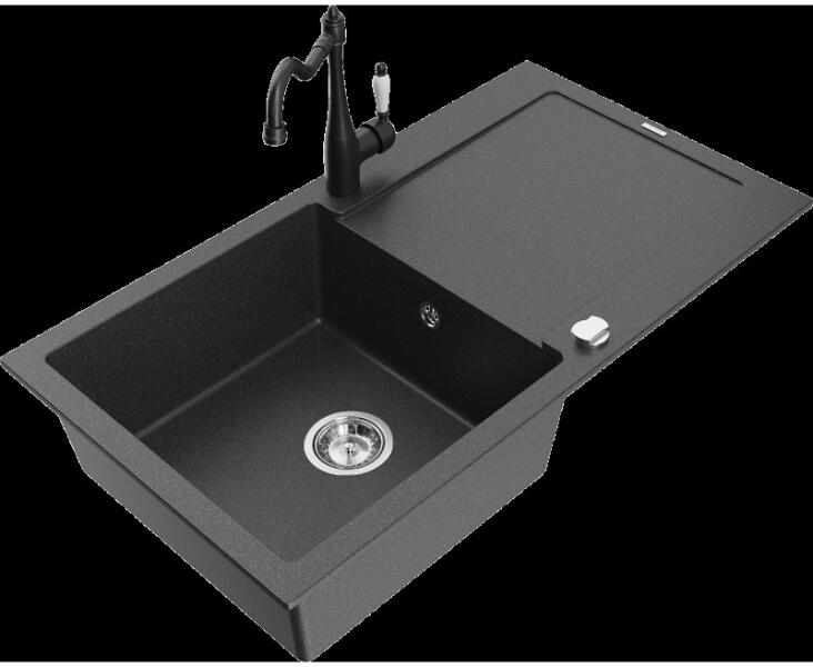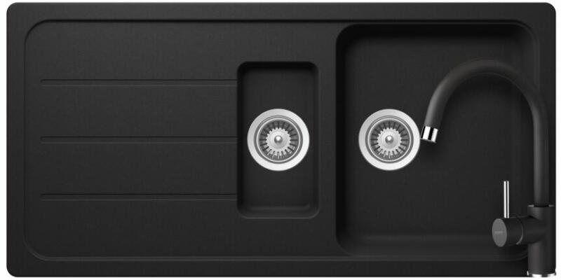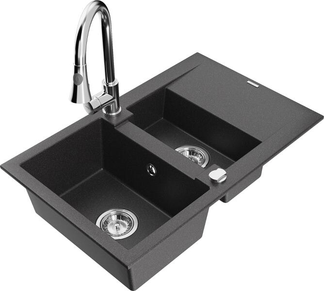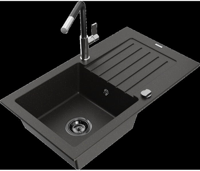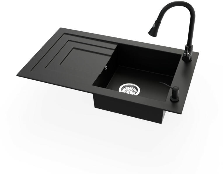 Nero Cortina gránit mosogató matt fekete színben. A teljes készlet tartalmazza a mosogatót, a kihúzható, zuhanyfejes Snake csaptelepet, a szifonkészletet és a mosogatószer adagolót. A csaptelep és az adagoló a medence külső peremén helyezkedik el, így biztosítva több helyet és jobb hozzáférést a csepegtető részhez, mindemellett modernebb megjelenést is eredményez. Letisz