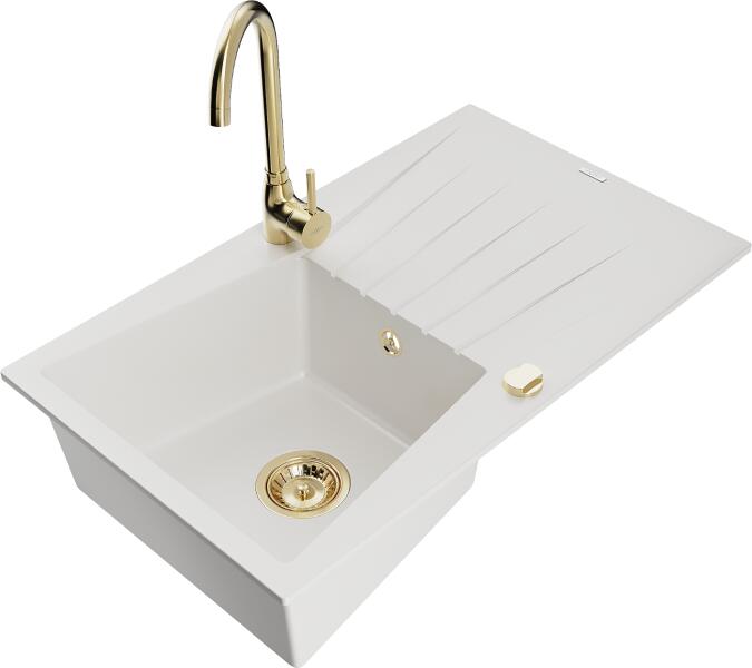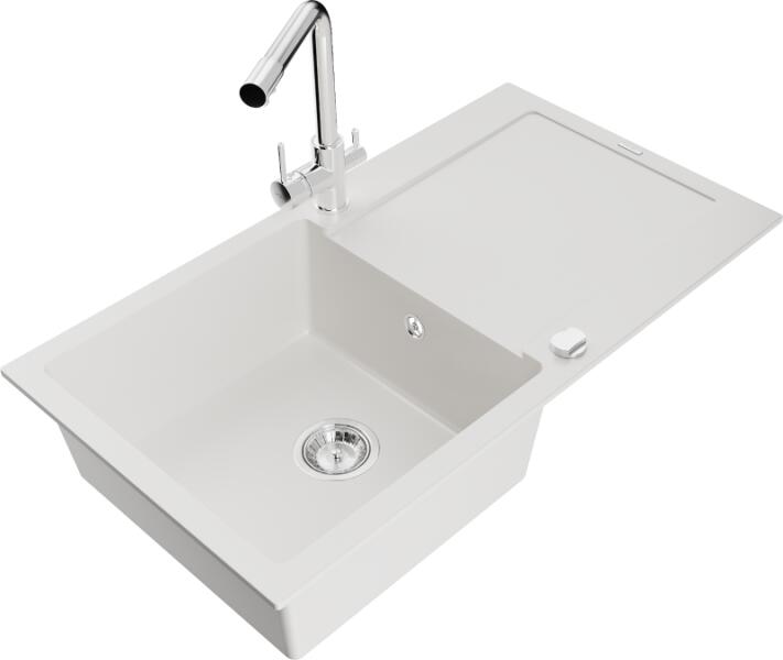 Mexen Leo, gránit mosogató 900x500x190 mm, 1 kamrás és Duero króm csaptelep, fehér, 6501-20-671600-00 Gyártó: Mexen Sorozat: Leo Modell: 1-kamrás s csepegtetővel Fehér szín Felületkezelés: sima Hossza 900 mm Szélesség 500 mm Magasság: 190 mm Kamra mélysége: 180 mm Kamra mérete: 430x415 mm 500 mm-es méretű szekrényekhez Szifon + automatikus leeresztő csavar Anyaga: gránit