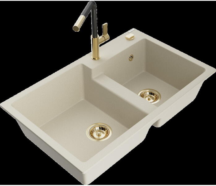 Mexen Mario, gránit mosogató 820x436x161 mm, 2 kamrás és Aster mosogató csaptelep, bézs, 6504-69-73450-07 Gyártó: Mexen Sorozat: Mario + Aster Mosogató: Méretek: 820x436x161 mm Szín: bézs Kamra mélysége: 151 mm Kamra méretei: 356x336 mm Lefolyó átmérője: ø90 mm Típus: 2 kamrás Típus: felülről az asztal munkalapjába süllyesztve Anyaga: gránit (80% gránit adalékanyag 20