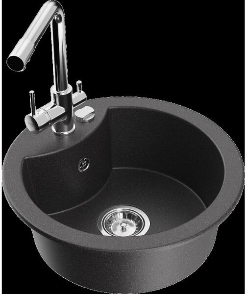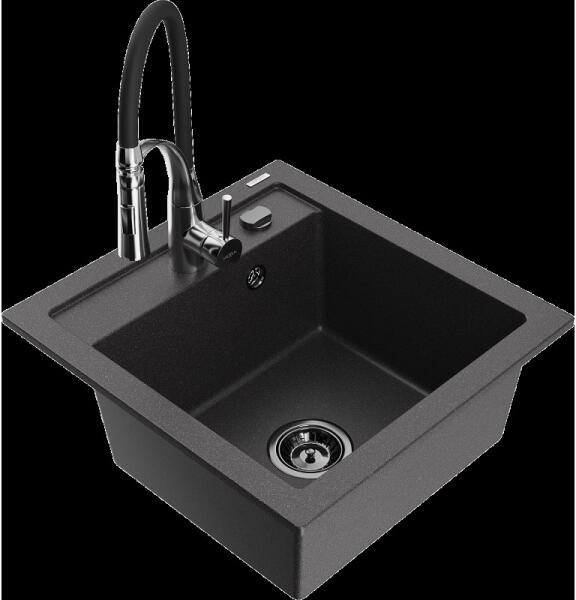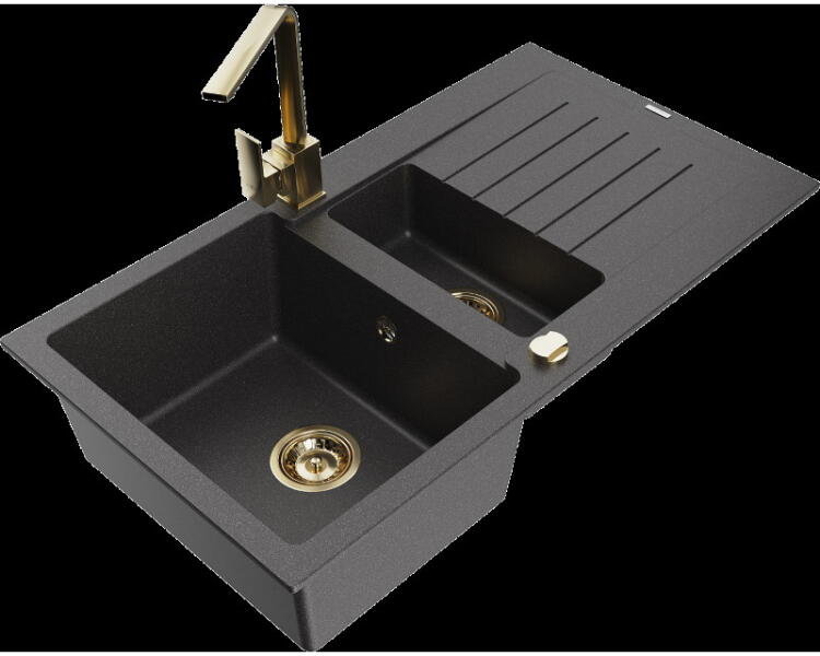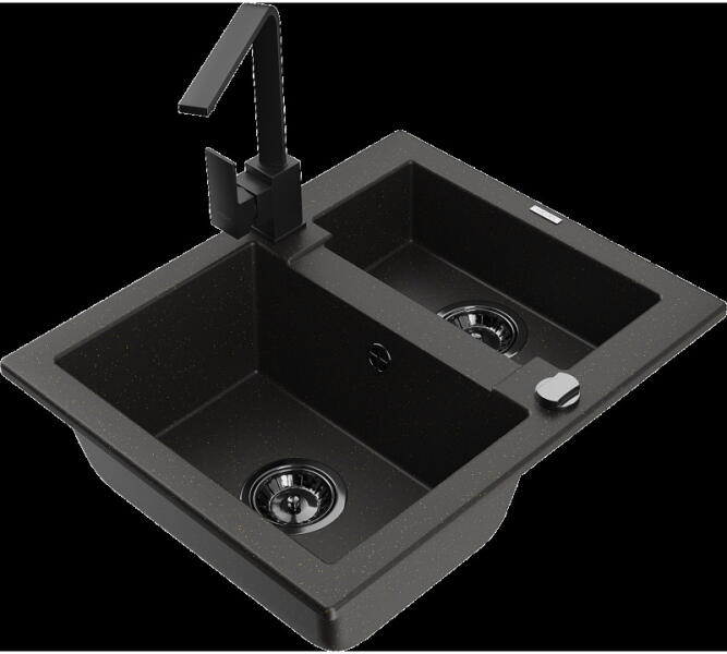 Mexen Bruno, 1 kamrás gránit mosogató lefolyóval 795x495x200 mm és fekete Duero csaptelep, fekete-ezüst metál, 6513-73-671600-70 Mosogató: Mérete: 795x495x200 mm Kamra mélysége: 190 mm Kamra méretei: 440x360 mm Lefolyó átmérője: ø90 mm Típus: 1 kamrás csepegtetővel Típus: a munkalapba süllyesztve Szín: fekete - ezüst metál Anyaga: gránit (80% gránit adalékanyag 20% gyan