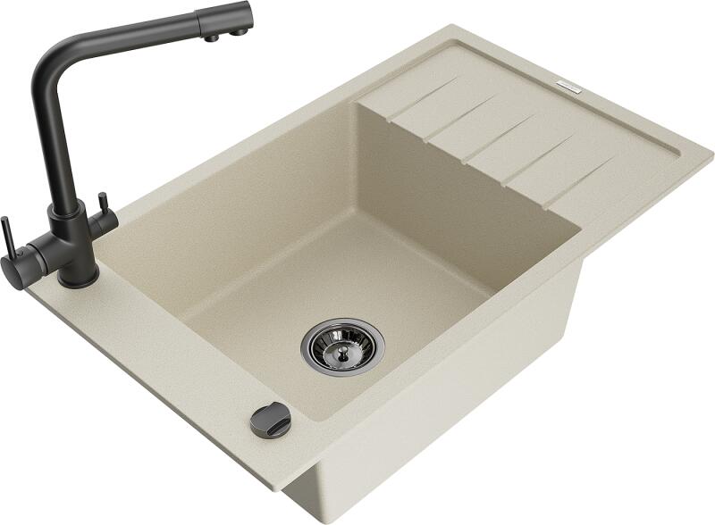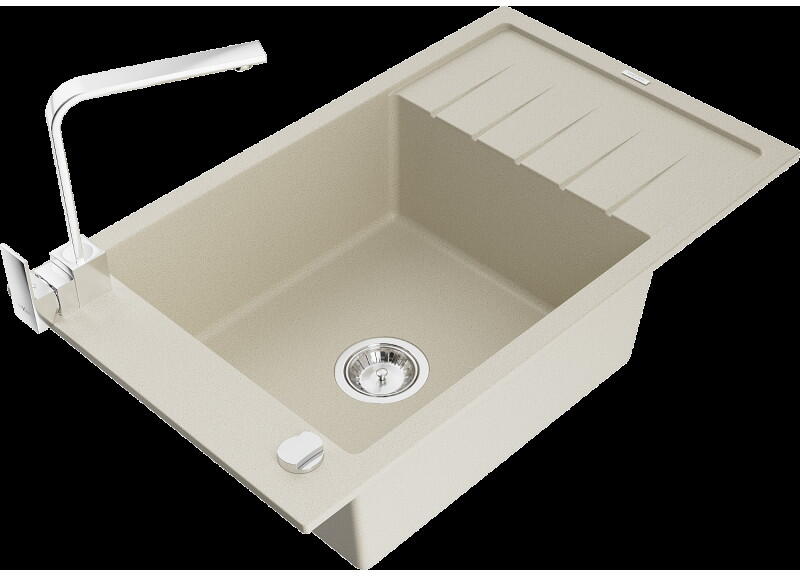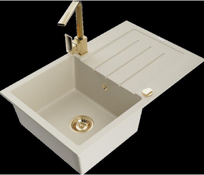Mexen Elias, 1 kamrás gránit mosogató lefolyóval 795x480x200 mm és fekete Duero, bézs, 6511-69-671600-70 Elias konyhai mosogató: Szín: bézs Mérete: 795x480x200 mm Kamra mélysége: 190 mm Kamra méretei: 465x420 mm Lefolyó átmérője: ø90 mm Típus: 1 kamrás, rövid csepegtetővel Típus: a pultba süllyesztve Anyaga: gránit (80% gránit adalékanyag 20% gyanta) Túlfolyó lyuk: ige
