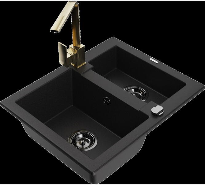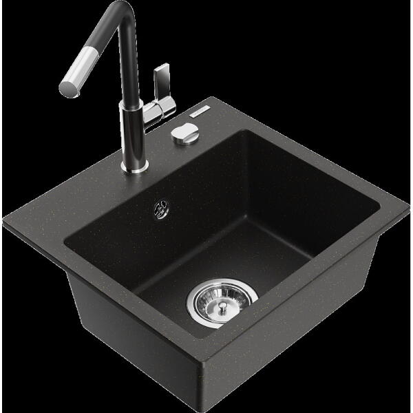 Mexen Elias, 1 kamrás gránit mosogató lefolyóval 795x480x200 mm és fekete Duero csaptelep, fekete - ezüst metál, 6511-73-671600-70-B Elias konyhai mosogató: Szín: fekete - ezüst metál Mérete: 795x480x200 mm Kamra mélysége: 190 mm Kamra méretei: 465x420 mm Lefolyó átmérője: ø90 mm Típus: 1 kamrás, rövid csepegtetővel Típus: a pultba süllyesztve Anyaga: gránit (80% gránit