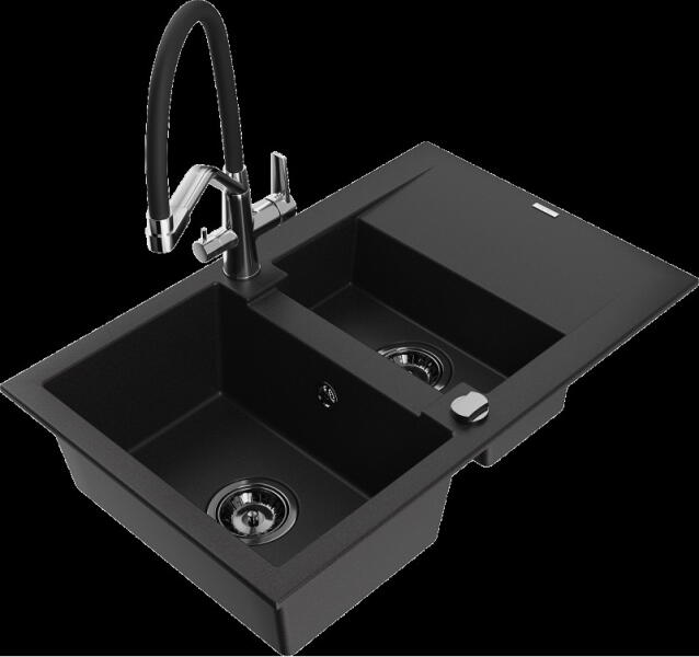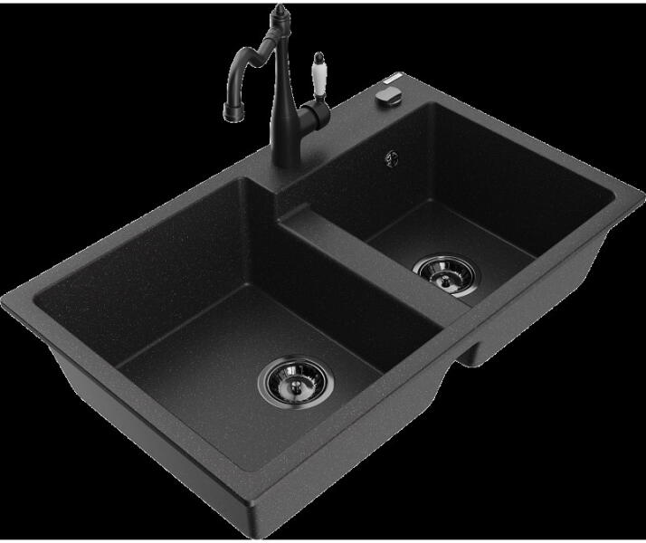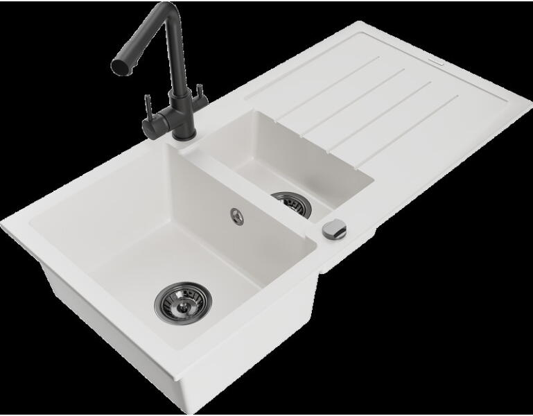 Gyártó: Mexen Sorozat: Andres + Savita Mosogató: Méretek: 1000x500x200 mm Kamra méretei: 430x330 mm (nagyobb), 340x170 mm (kisebb) Kamra mélysége: 190 mm (nagyobb), 115 mm (kisebb) Lefolyó átmérője: ø90 mm Típus: 1,5-kamrás lefolyóval Mosogató típusa: a munkalapba való beágyazáshoz Anyaga: gránit (80% gránit adalékanyag 20% gyanta) Túlfolyó nyílás: Igen Lyukak: 2 (1 lyuk