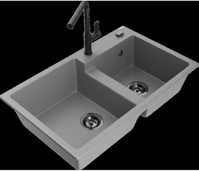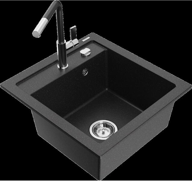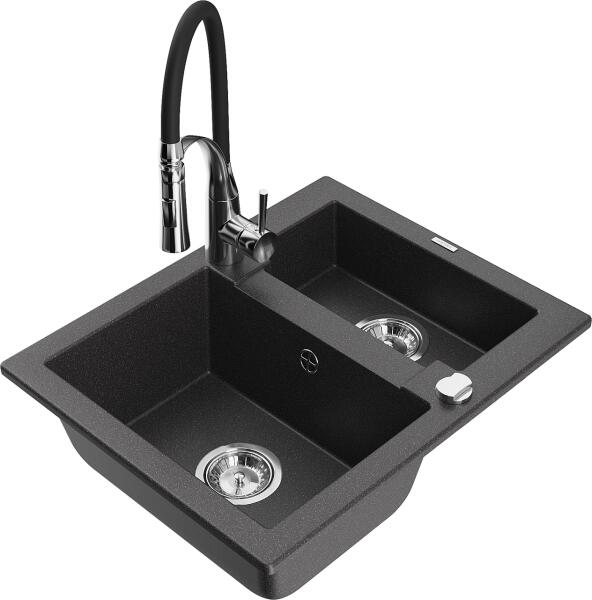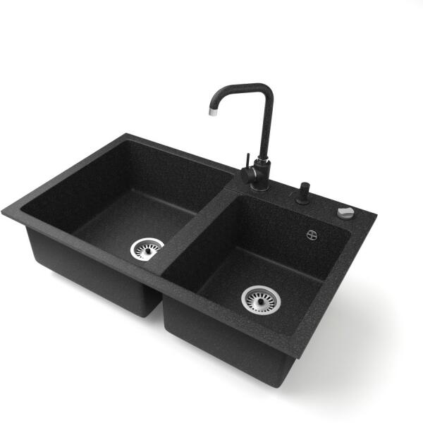 NERO Palazzo gránit mosogatótálca szemcsés fekete színben csapteleppel, automata dugókiemelővel és adagolóval. A kétmedencés mosogatótálcák 21. századi csúcsmodellje, ami két nagyméretű medencéjével és különleges kialakításával minden konyha tökéletes eleme lehet. Az asszimetrikus kialakításnak köszönhetően a kisebb medence fölött egy praktikus perem helyezkedik