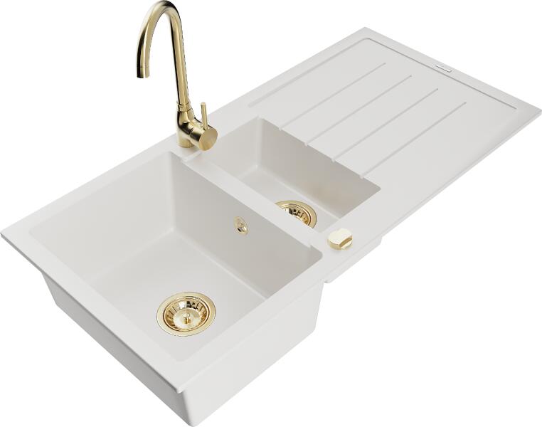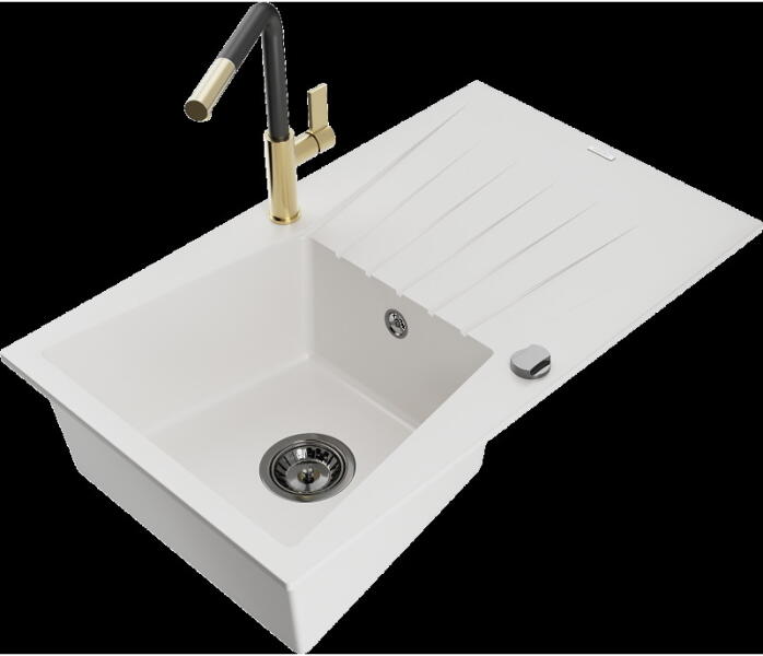 Mexen Andres 1,5 kamrás gránit konyhai mosogató csepptálcával 100x50 cm konyhai csaptelep Telma, fehér, 6515-20-670200-50 Mosogató: Termékkód: 6515101510-20 Mérete: 1000x500x200 mm Kamra mélysége: 190 mm (nagyobb), 115 mm (kisebb) Kamra méretei: 430x330 mm (nagyobb), 340x170 mm (kisebb) Lefolyó átmérője: ø90 mm Típus: 1,5 tál csepegtetőtálcával Típus: A táblába süllyeszt