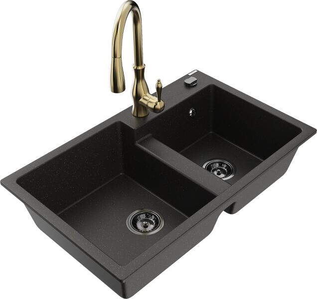 Mexen Tomas, gránit mosogató 800x500x190 mm, 2 kamrás és Savita mosogató csaptelep, fekete-arany metál, 6516-75-672601-50-B A konyhai mosogató műszaki adatai: Gyártó: Mexen Sorozat: Tomas Modell: 2-kamrás csepptálca nélkül Beépítés: a munkalapba való beágyazáshoz Szín: fekete - arany metál Felületkezelés: sima Hossza 800 mm Szélesség 500 mm Magasság: 190 mm Kamra mélys