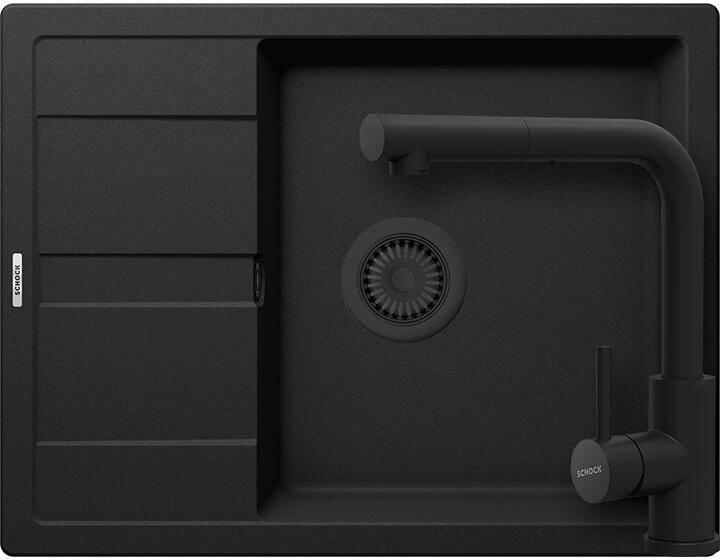Schock Ronda D-100L konyhai mosogatótálca Cristalite Nero 650 x 500 mm, gránit, megfordítható, hagyományos beépítés, fekete munkalapba beépíthető, egymedencés, megfordítható, csepegtetővel ellátott, ideálisan illeszkedik a minimum 50 cm-es alsószekrényhez. A csaptelep helye előre elkészített, könnyedén áttörhető. A csomagban találja a használati útmutatót, amely ré