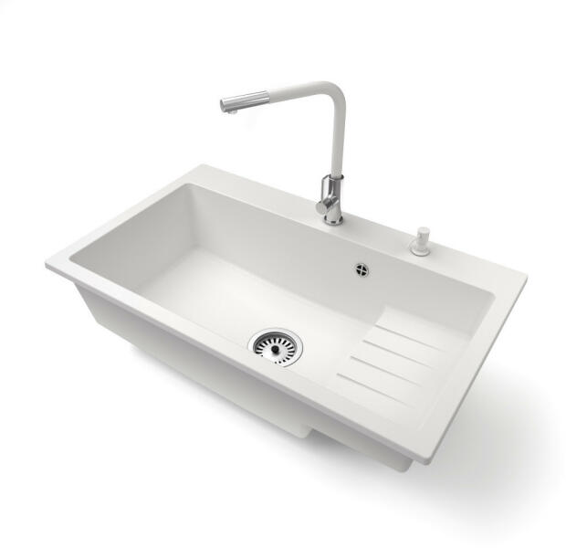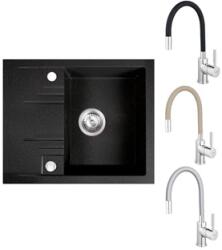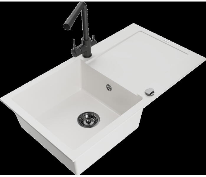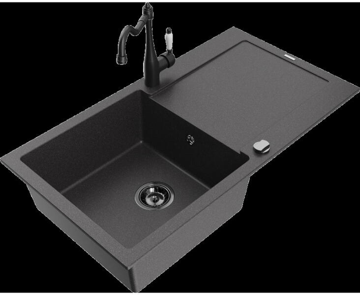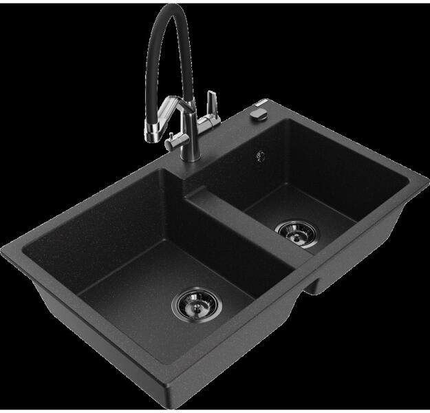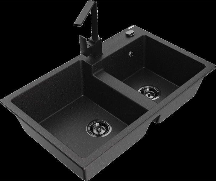 Mario konyhai mosogató: Méretek: 820x436x161 mm Kamra mélysége: 151 mm Kamra méretei: 356x336 mm Lefolyó átmérője: ø90 mm Típus: 2 kamrás Típus: felülről a munkalapba süllyesztve Anyaga: gránit (80% gránit adalékanyag 20% gyanta) Túlfolyó lyuk: igen Lyukak: 2 (1 x mosogató csaptelep, 1 x automatikus leeresztő csavar vezérlés) Nagy ellenállás a karcolásokkal és el