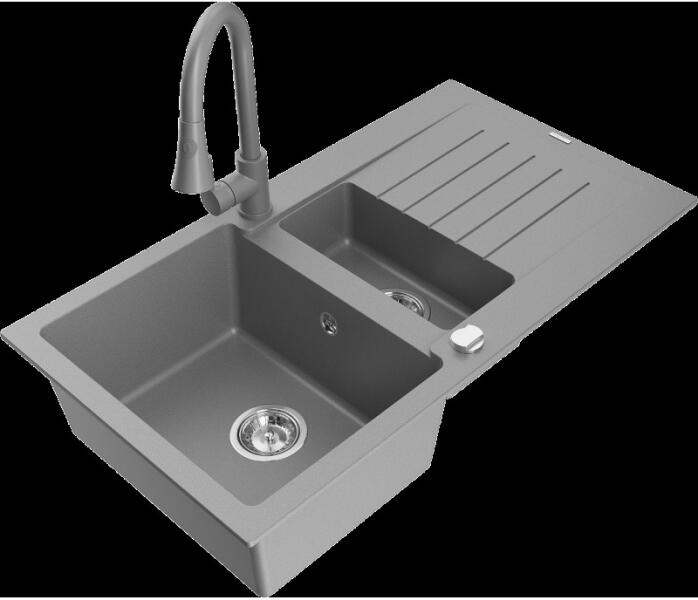 Mexen Mario, gránit mosogató 820x436x161 mm, 2 kamrás, szürke króm szifonnal és fekete Rita mosogató csaptelep, 6504-71-670300-70 Gyártó: Mexen Sorozat: Mario Modell: 2 kamrás Szín: szürke Felületkezelés: sima Felszerelés: munkalapra Hossza 820 mm Szélesség 436 mm Magasság: 161 mm Kamra mélysége: 151 mm Kamra mérete: 356x336 mm Lefolyó átmérője: 90 mm Szifon + automatikus