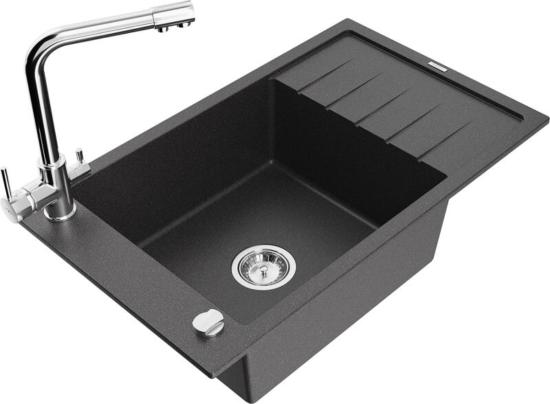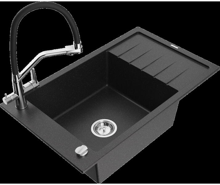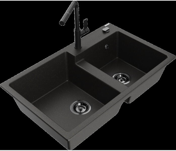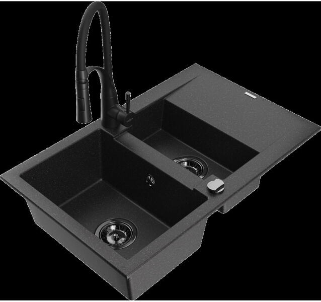 Mexen Elias, 1 rekeszes gránit mosogató lefolyóval 795x480x200 mm Duero króm csapteleppel, fekete - foltos, 6511-76-671600-00 Elias konyhai mosogató: Szín: fekete foltos Mérete: 795x480x200 mm Kamra mélysége: 190 mm Kamra méretei: 465x420 mm Lefolyó átmérője: ø90 mm Típus: 1 kamrás, rövid csepegtetővel Típus: a pultba süllyesztve Anyaga: gránit (80% gránit adalékanyag 20% g