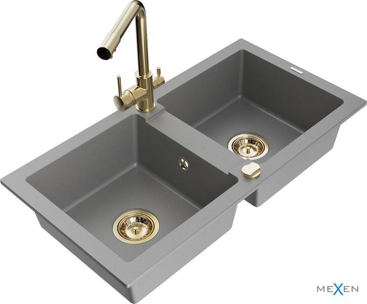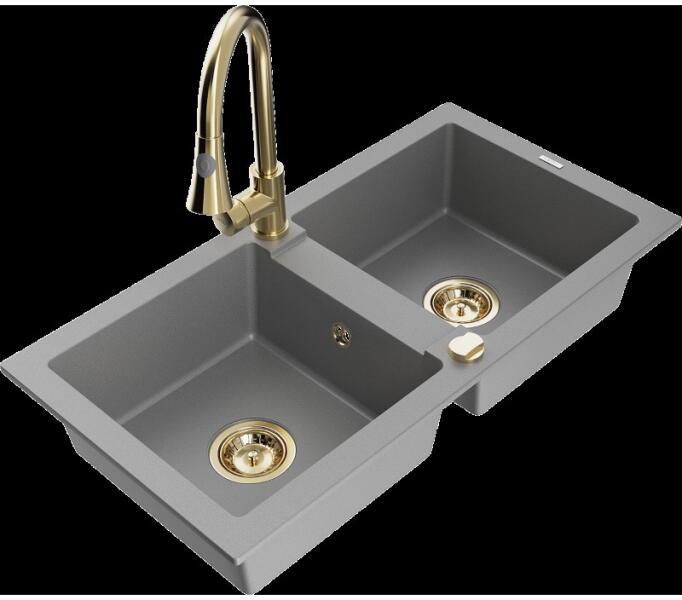 Mexen Mario, 2-kamrás gránit mosogató 820x436x161 mm és Duero króm mosogató csaptelep, szürke, 6504-71-671600-50 Gyártó: Mexen Sorozat: Mario Termékkód: 6504822000-71 Szín: szürke Mérete: 820x436x161 mm Kamra mélysége: 151 mm Kamra méretei: 356x336 mm Lefolyó átmérője: ø90 mm Típus: 2 kamrás Típus: a pultba süllyesztve Anyaga: gránit (80% gránit adalékanyag 20% gyanta)
