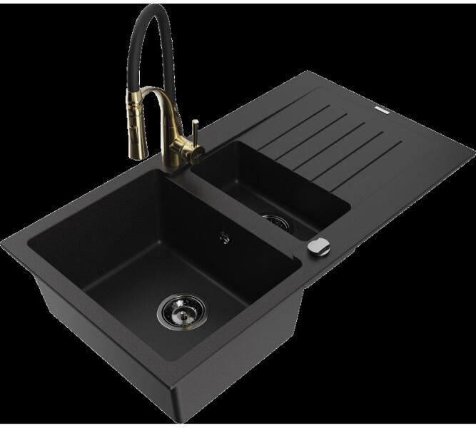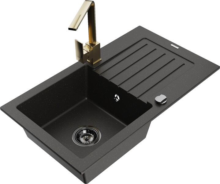 Mexen Pablo, gránit mosogató 752x436x161 mm, 1 kamrás és arany csaptelep Rita, fekete-arany metál, 6510-75-670300-50-B Gyártó: Mexen Sorozat: Pablo Mérete: 752x436x161 mm Kamra mélysége: 151 mm Kamra méretei: 356x332 mm Lefolyó átmérője: ø90 mm Szín: fekete - arany metál Típus: 1 kamrás csepegtetővel Típus: az asztallapba ágyazva Anyaga: gránit (80% gránit adalékanyag 20