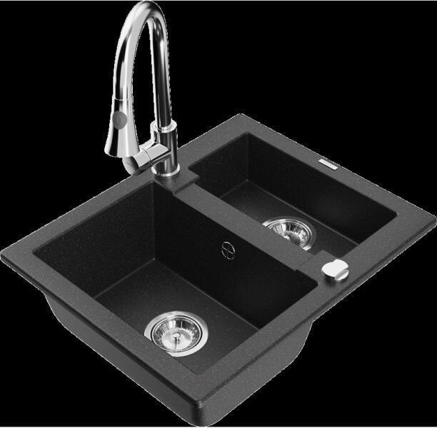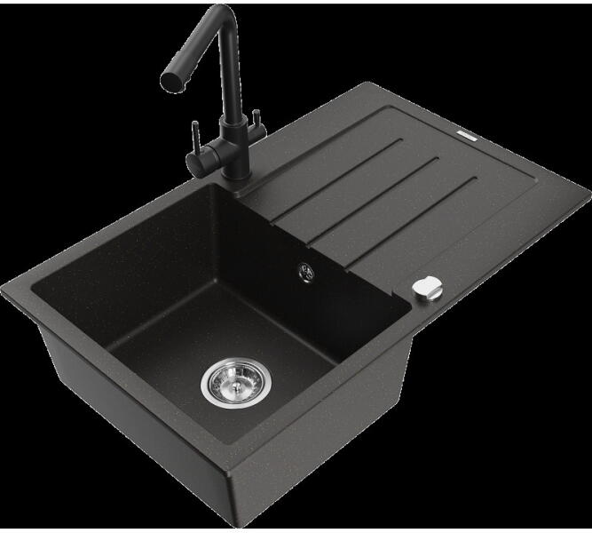 Mexen Mario, gránit mosogató 820x436x161 mm, 2-kamrás és mosogató csaptelep Carla, fekete-ezüst metál, 6504-73-670700-00 Gyártó: Mexen Sorozat: Mario + Carlo Mosogató: Méretek: 820x436x161 mm Kamra mélysége: 151 mm Kamra méretei: 356x336 mm Lefolyó átmérője: ø90 mm Típus: 2 kamrás Típus: felülről az asztal munkalapjába süllyesztve Anyaga: gránit (80% gránit adalékanyag
