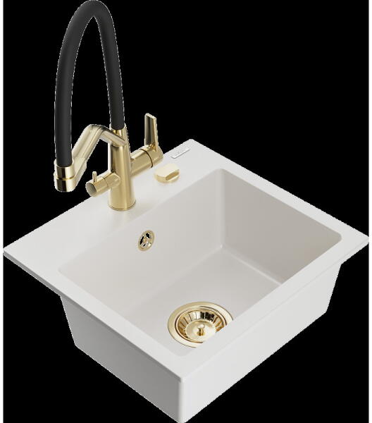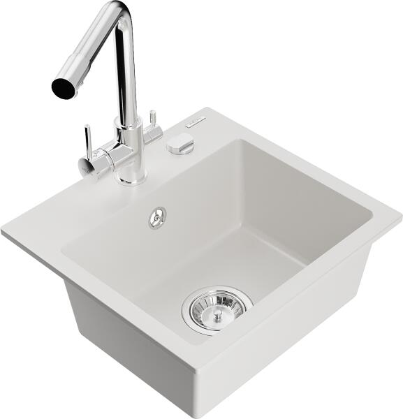 Mexen Milo, gránit mosogató 435x410x171 mm, 1 kamrás és Duero króm csaptelep, fehér, 6505-20-671600-00 A konyhai mosogató műszaki adatai: Gyártó: Mexen Sorozat: Milo Modell: 1 kamrás Felszerelés: munkalapra Fehér szín Hossza 435 mm Szélesség 410 mm Magasság: 171 mm Kamra mélysége: 161 mm Kamra mérete: 375x280 mm Lefolyó átmérője: Ø 90 mm Szifon + automatikus leeresztő An