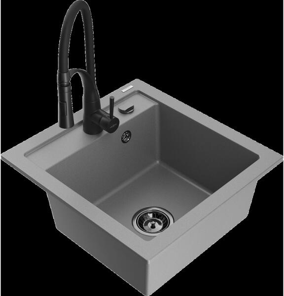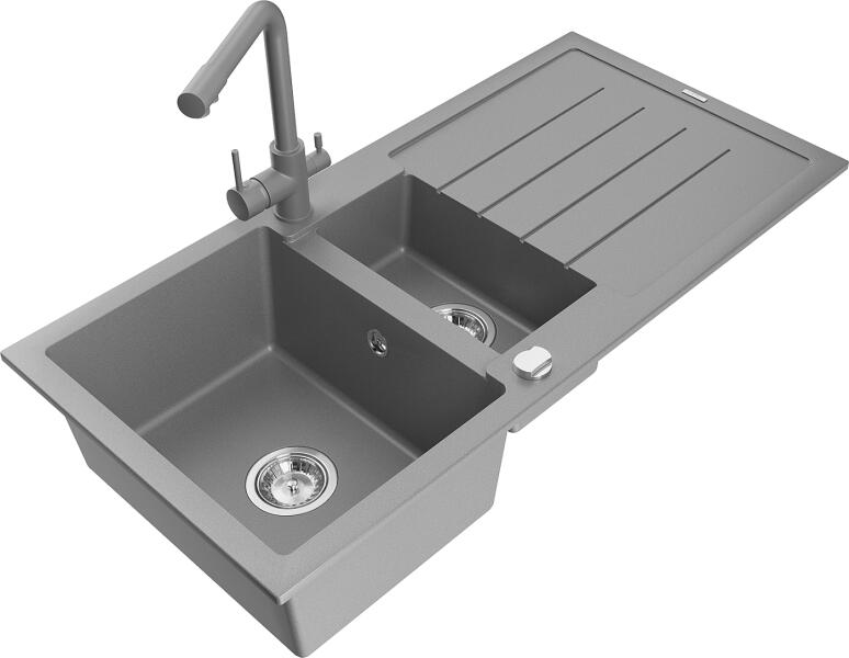 Mexen Andres, gránit mosogató 1000x500x200 mm, 1,5 kamrás + szürke csaptelep Duero, szürke, 6515-71-671600-71 Gyártó: Mexen Sorozat: Andres Modell: 1,5-kamrás lefolyóval Felszerelés: munkalapra Szín: szürke Felületkezelés : sima Hossza 1000 mm Szélesség 500 mm Magasság: 200 mm Kamra mélysége: 190 mm (nagyobb), 115 mm (kisebb) Kamra mérete: 430x330 mm (nagyobb), 340x170 mm (kise