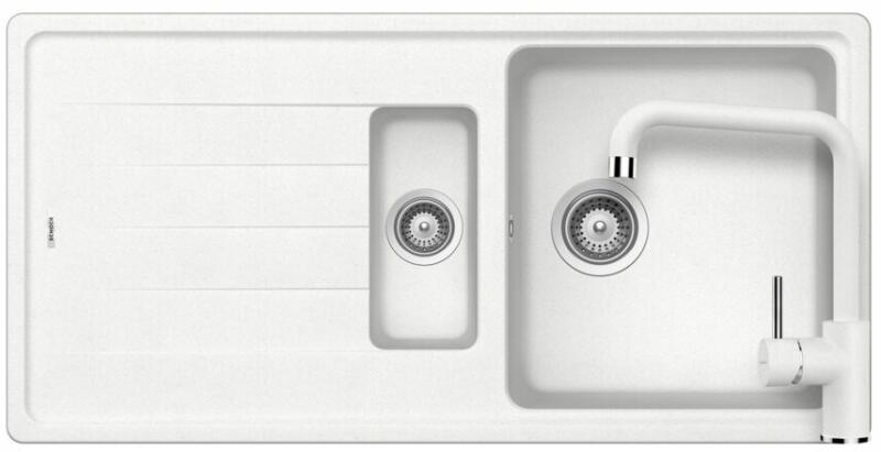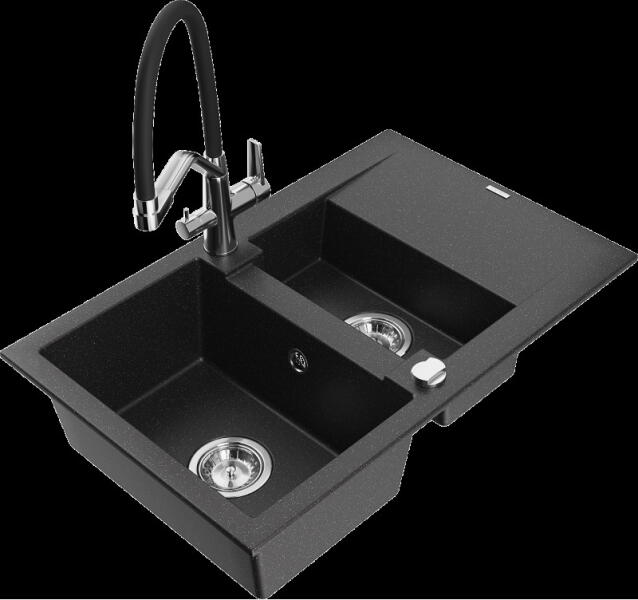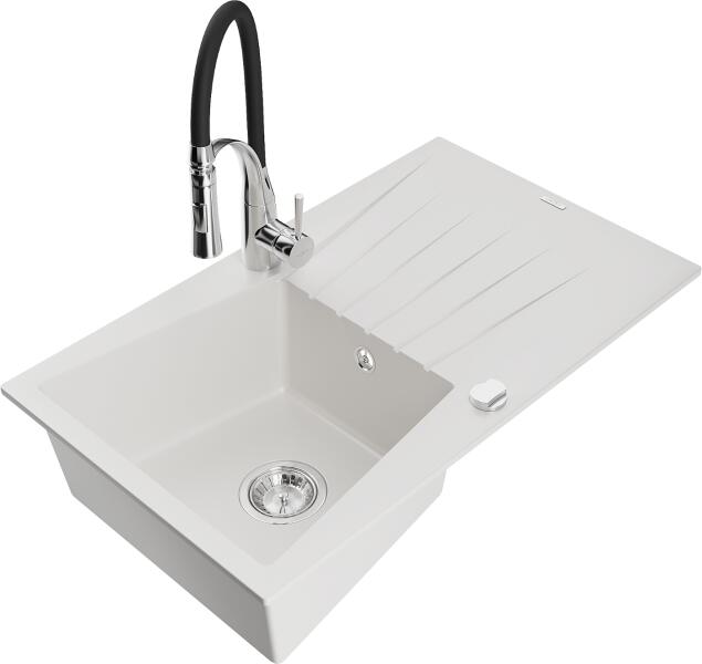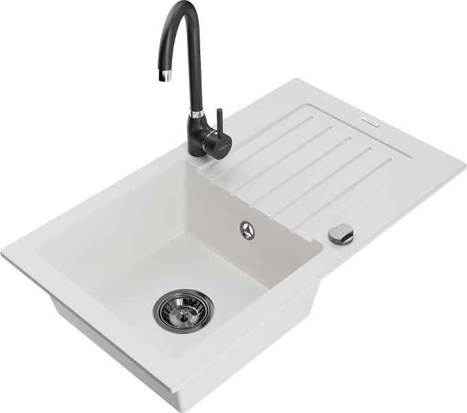 Mexen Pablo, gránit mosogató 752x436x161 mm, 1 kamrás és fekete Telma csaptelep, fehér, 6510-20-670200-70 Gyártó: Mexen Sorozat: Pablo Mérete: 752x436x161 mm Kamra mélysége: 151 mm Kamra méretei: 356x332 mm Lefolyó átmérője: ø90 mm Fehér szín Típus: 1 kamrás csepegtetővel Típus: az asztallapba ágyazva Anyaga: gránit (80% gránit adalékanyag 20% gyanta) Túlfolyó lyuk: ig