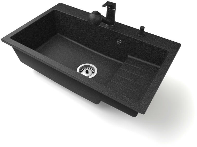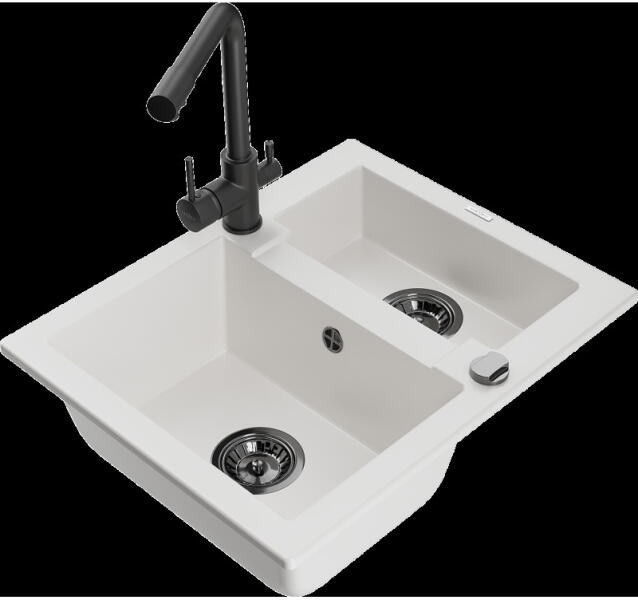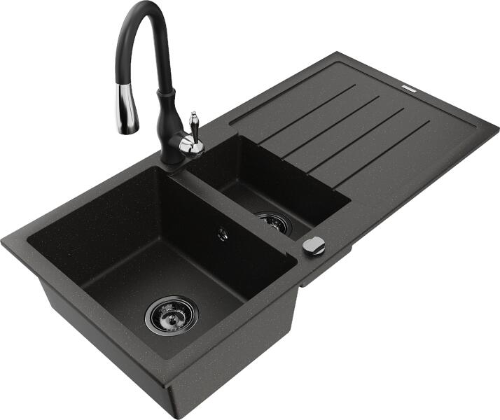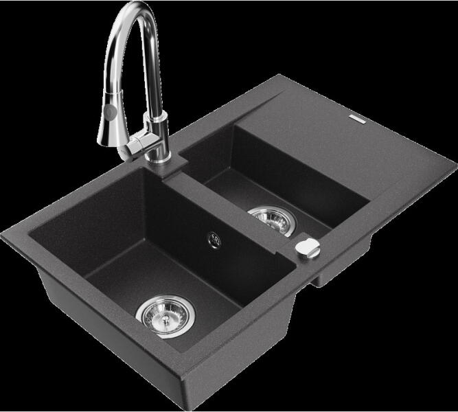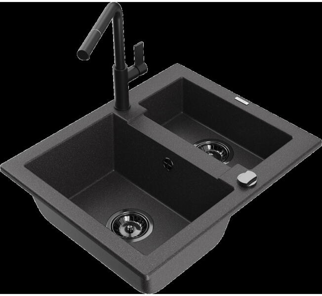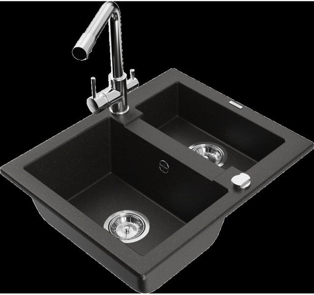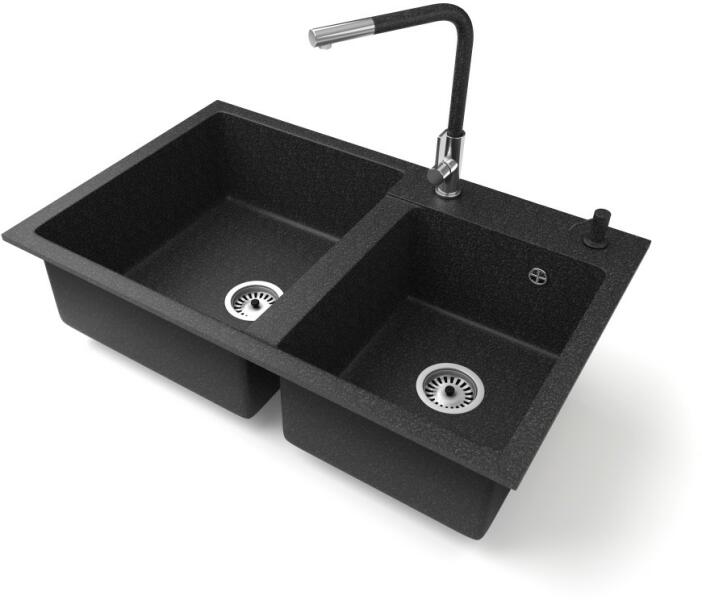 NERO Palazzo gránit mosogatótálca szemcsés fekete színben csapteleppel és adagolóval. A kétmedencés mosogatótálcák 21. századi csúcsmodellje, ami két nagyméretű medencéjével és különleges kialakításával minden konyha tökéletes eleme lehet. Az asszimetrikus kialakításnak köszönhetően a kisebb medence fölött egy praktikus perem helyezkedik el, ahol helyet kapott a c