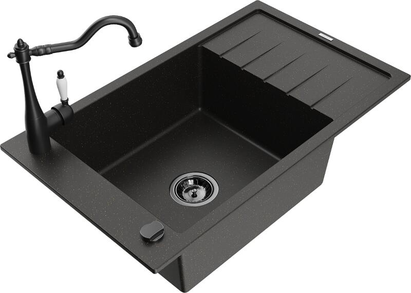 Mexen Elias, gránit mosogató 795x480x200 mm, 1 kamrás és mosogató csaptelep Carla, fekete-arany metál, 6511-75-670700-70-B Elias konyhai mosogató: Szín: fekete - arany metál Méretek: 795x480x200 mm Kamra mélysége: 190 mm Kamra méretei: 465x420 mm Lefolyó átmérője: ø90 mm Típus: 1 kamrás, rövid csepegtetővel Beépítés: felülről a munkalapba süllyesztve Anyaga: gránit (80