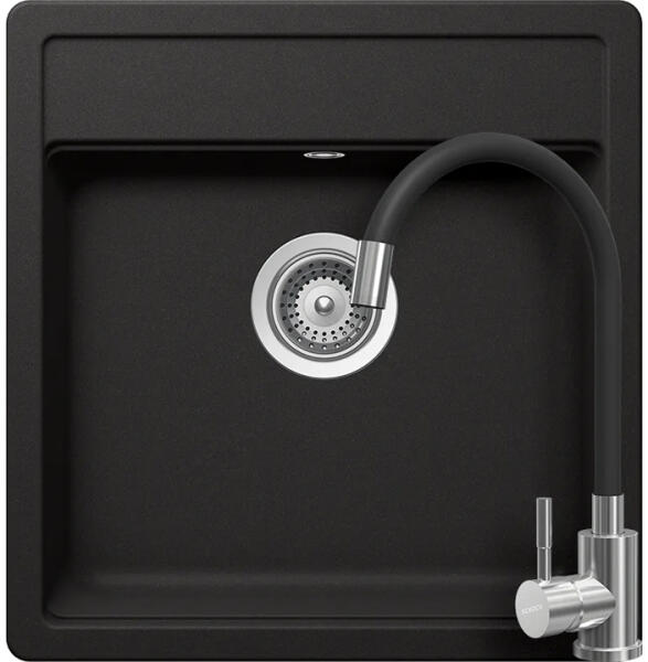 Schock Nemo N-100S konyhai mosogatótálca Cristalite Nero 490 x 510 mm, gránit, hagyományos beépítés, fekete munkalapba beépíthető, egymedencés, csepegtető nélküli, ideálisan illeszkedik a minimum 50 cm-es alsószekrényhez. A csaptelep helye előre elkészített, könnyedén áttörhető. A csomagban találja a használati útmutatót, amely részletes leírást ad a csaptelep hely