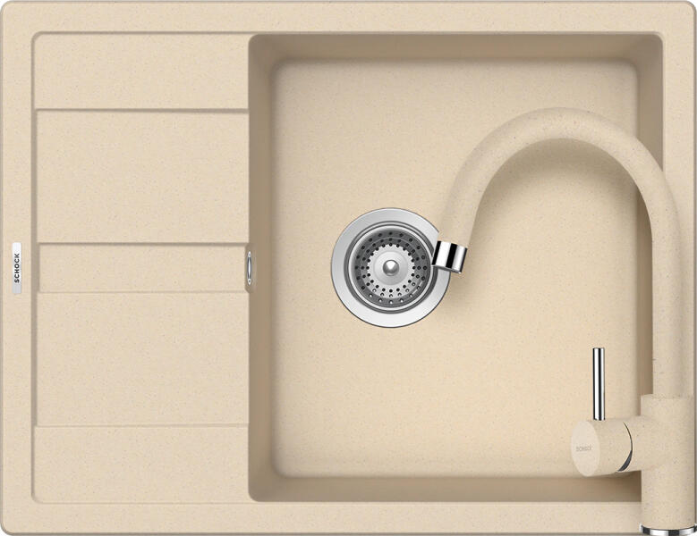 Schock Ronda D-100L konyhai mosogatótálca Cristalite Moonstone 650 x 500 mm, gránit, megfordítható, hagyományos beépítés, bézs munkalapba beépíthető, egymedencés, megfordítható, csepegtetővel ellátott, ideálisan illeszkedik a minimum 50 cm-es alsószekrényhez. A csaptelep helye előre elkészített, könnyedén áttörhető. A csomagban találja a használati útmutatót, amely