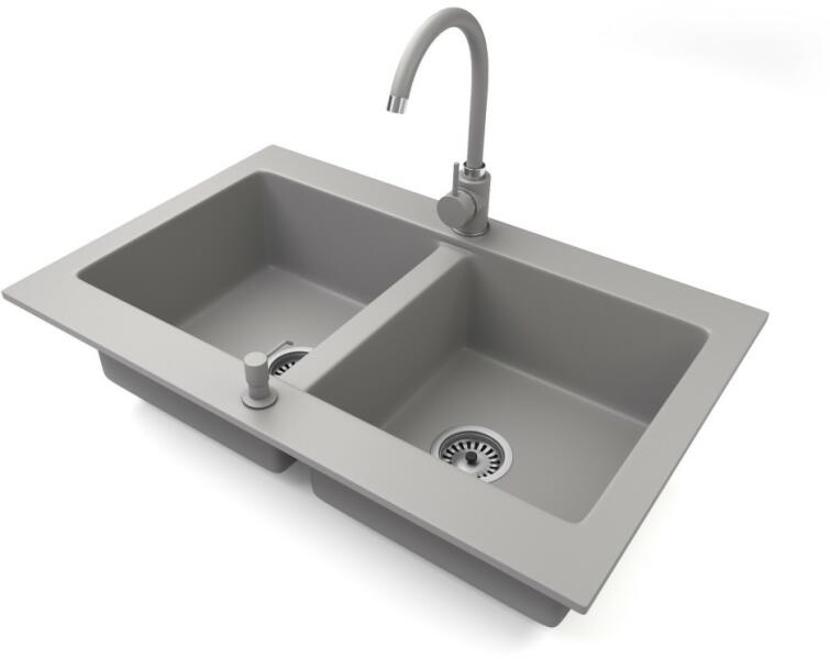 NERO Verso gránit mosogatótálca szürke színben csapteleppel és mosogatószer adagolóval. Kétmedencés, szimmetrikus elrendezésű mosogató, kellően nagyméretű medencékkel, a 75 cm-es szélesség egyszerre tágas és helytakarékos is. Letisztult formatervezés, kiemelkedő anyagvastagság jellemzi, ezáltal rendkívül masszív és ellenálló konstrukció. Anyaga 80% gránit őrlemé