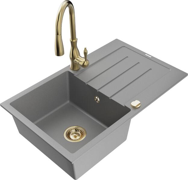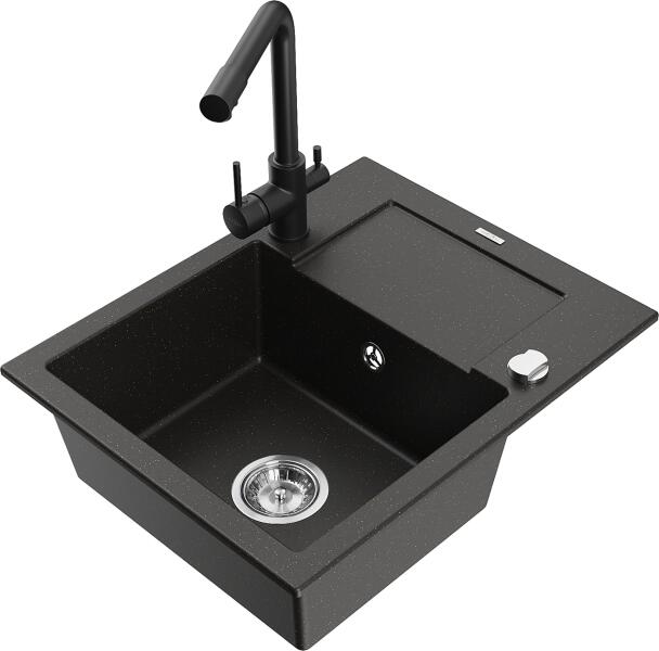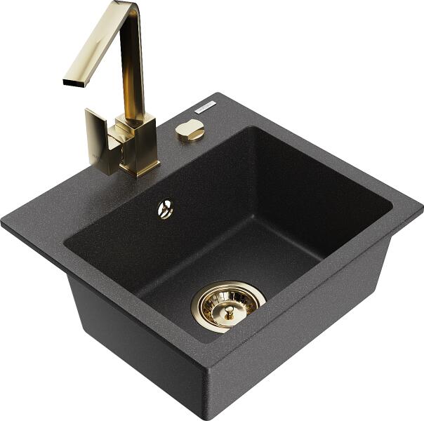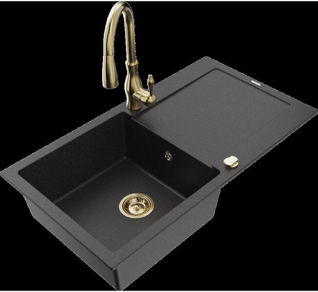 Mexen Enzo, gránit mosogató 576x465x174 mm, 1 kamrás, fekete matt Duero csaptelep, fekete-arany metál, 6506-75-671600-70 Gyártó: Mexen Sorozat: Enzo Modell: 1 kamrás, rövid csepegtetővel Hossza 576 mm Szélesség 465 mm Magasság: 174 mm Szín: fekete - arany metál Kamra mélysége: 164 mm Kamra mérete: 395x320 mm Szifon + automatikus leeresztő csavar Anyaga: gránit (80% gránit - kő