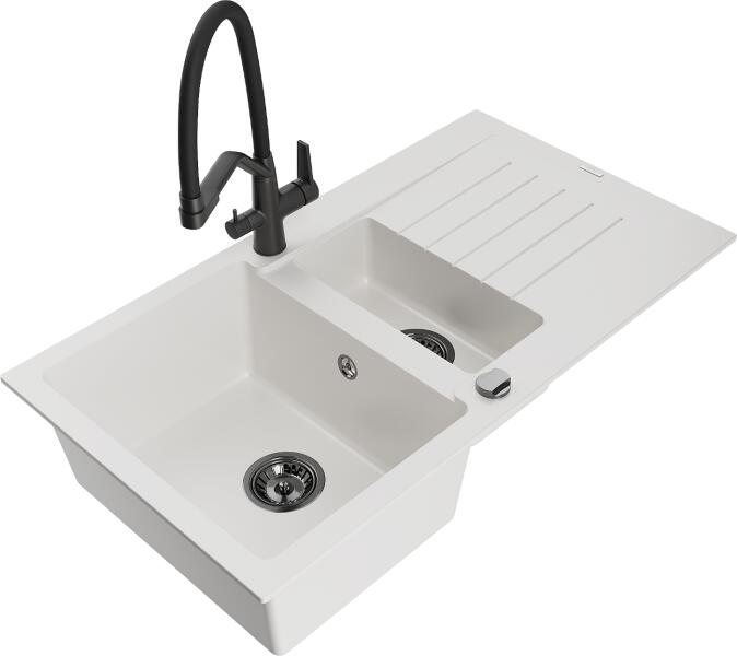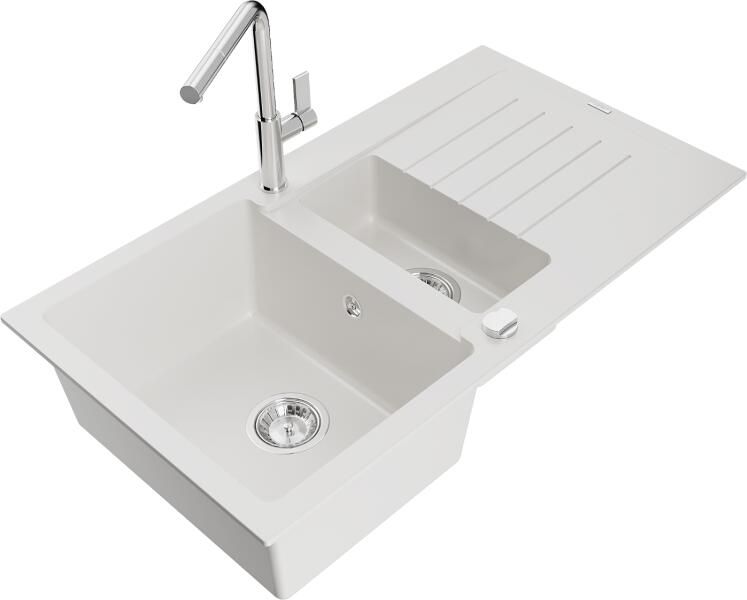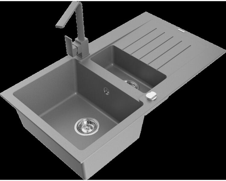 Matias konyhai mosogató: Gyártó: Mexen Sorozat: Matias Modell: 1,5-kamrás lefolyóval Beépítés: felülről a munkalapba való beágyazáshoz Hossz: 900 mm Szélesség: 505 mm Magasság: 200 mm Kamra mélysége: 180 mm (nagyobb), 115 mm (kisebb) Kamra mérete: 435x335 mm (nagyobb), 345x150 mm (kisebb) Lefolyó átmérője: 90 mm Szifon + automatikus leeresztő csavar Anyaga: gránit (80% gr